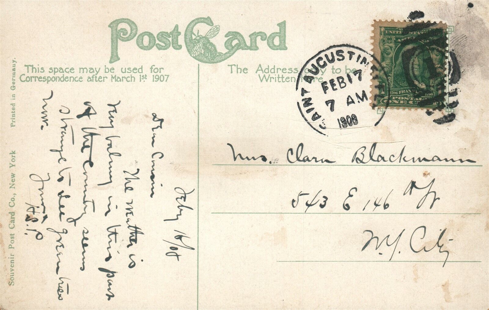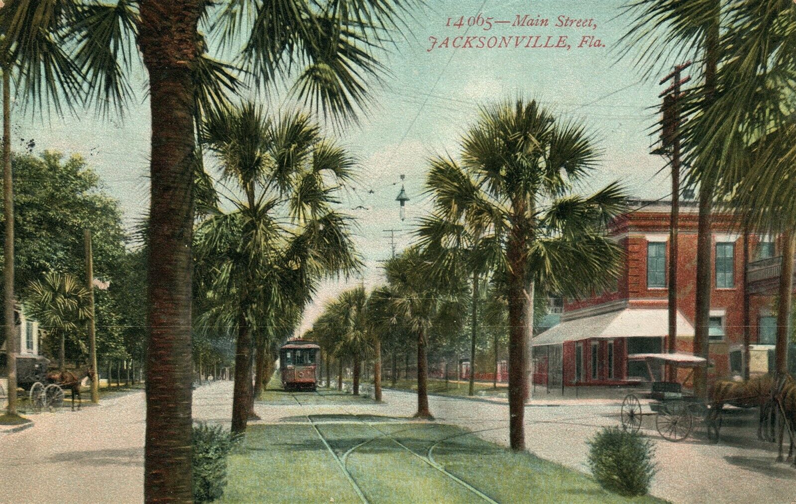 JACKSONVILLE FL MAIN STREET 1908 ANTIQUE POSTCARD w/ CORK CANCEL