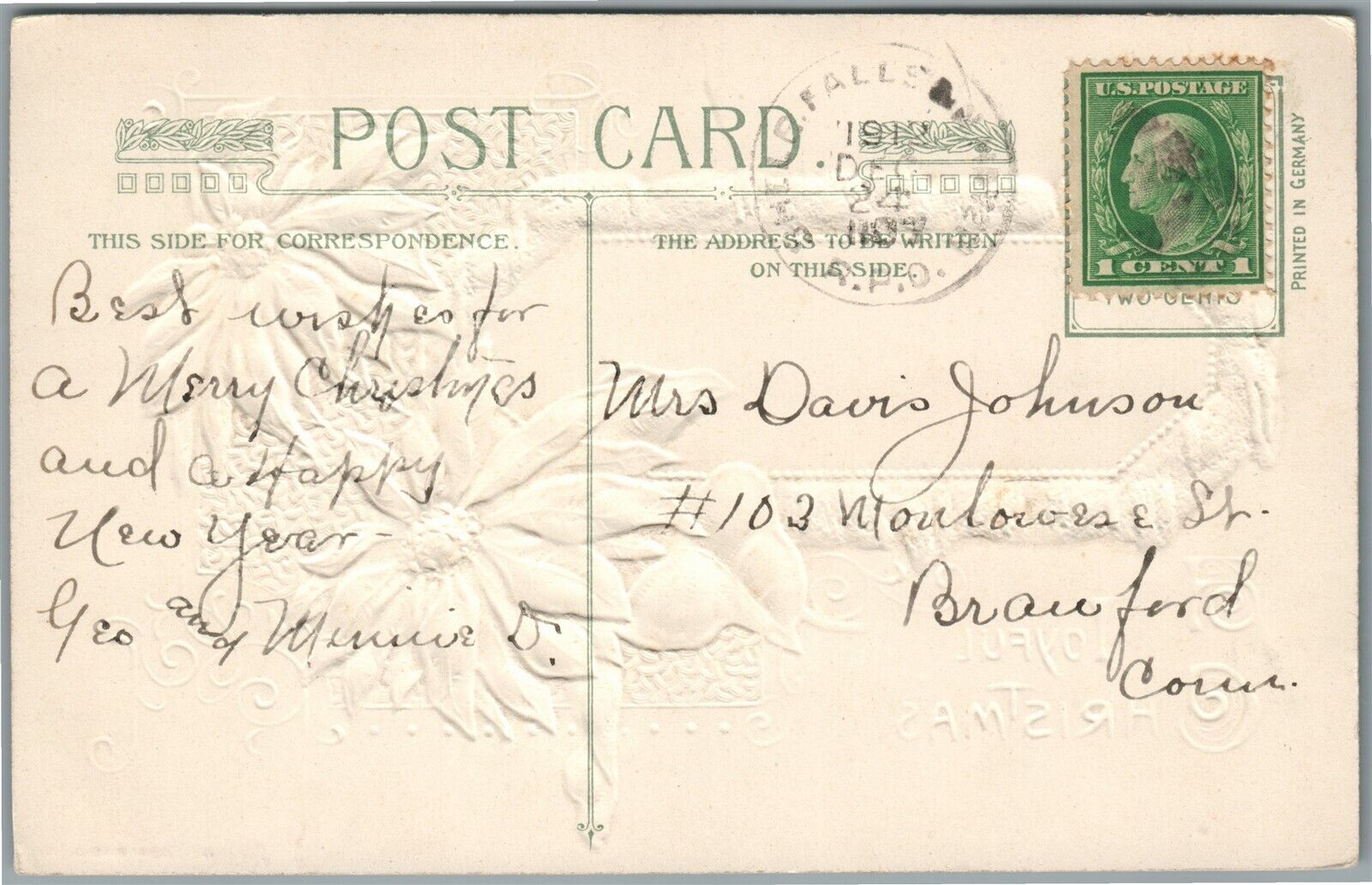 JOYFUL CHRISTMAS JOHN WINSCH 1910 EMBOSSED ANTIQUE POSTCARD