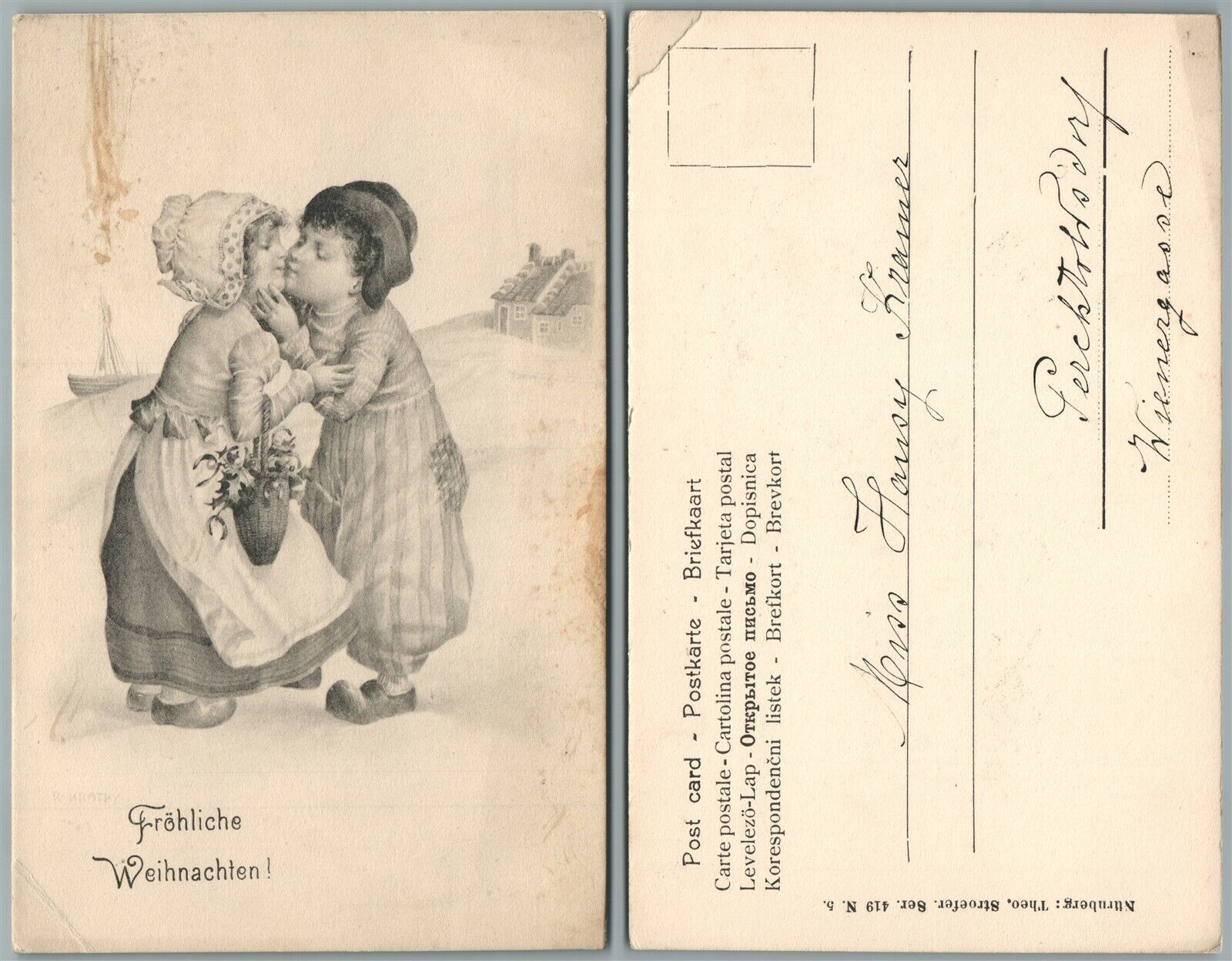 KISSING KIDS MERRY CHRISTMAS GERMAN ANTIQUE ART POSTCARD