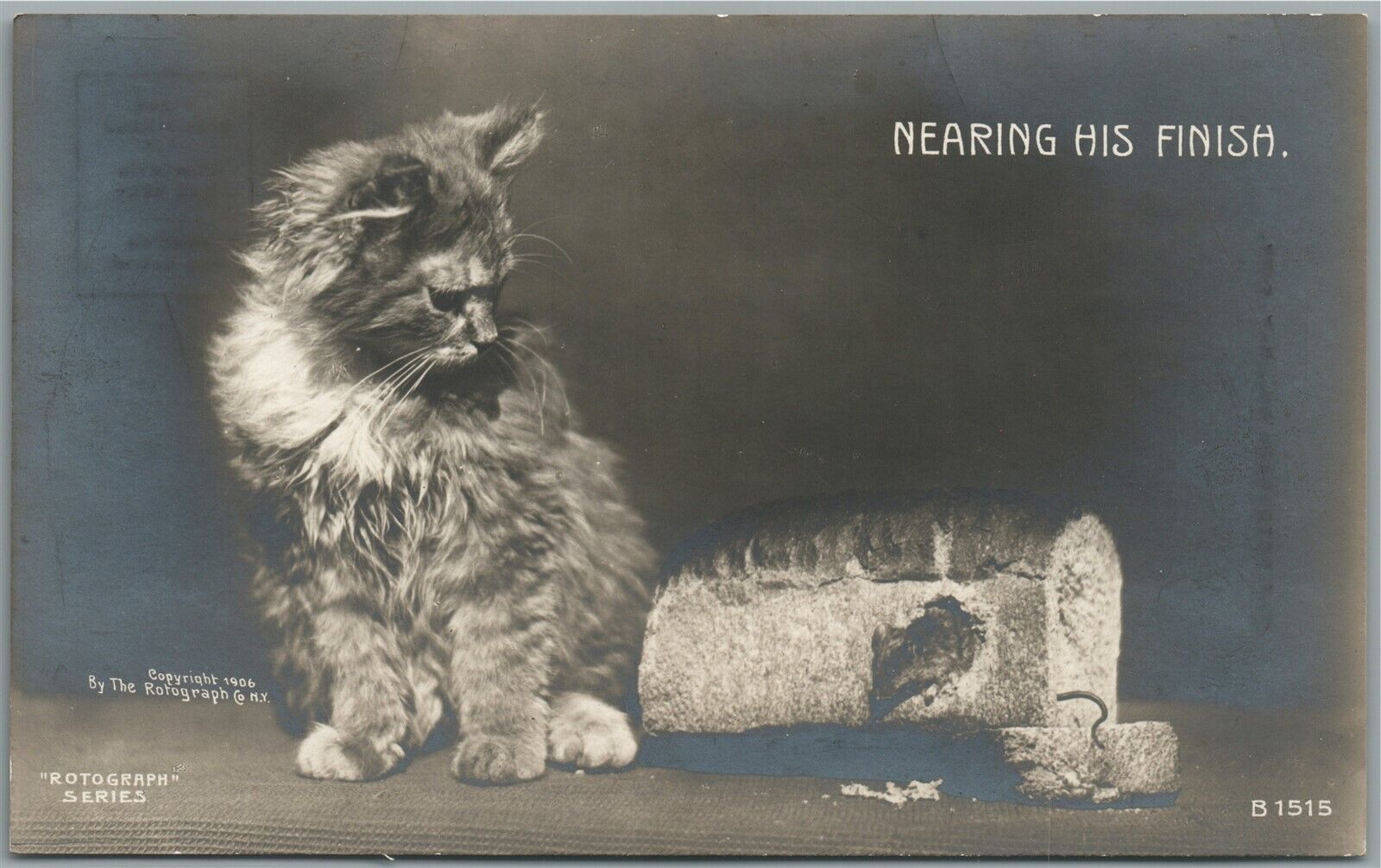 KITTEN w/ BREAD ANTIQUE REAL PHOTO POSTCARD RPPC