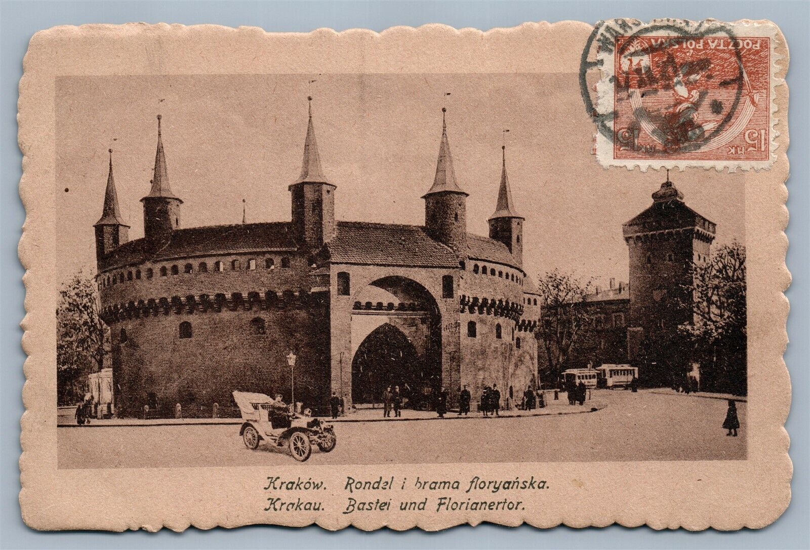 KRAKOW POLAND RONDEL I BRAMA FLORYANSKA ANTIQUE POSTCARD w/ STAMP