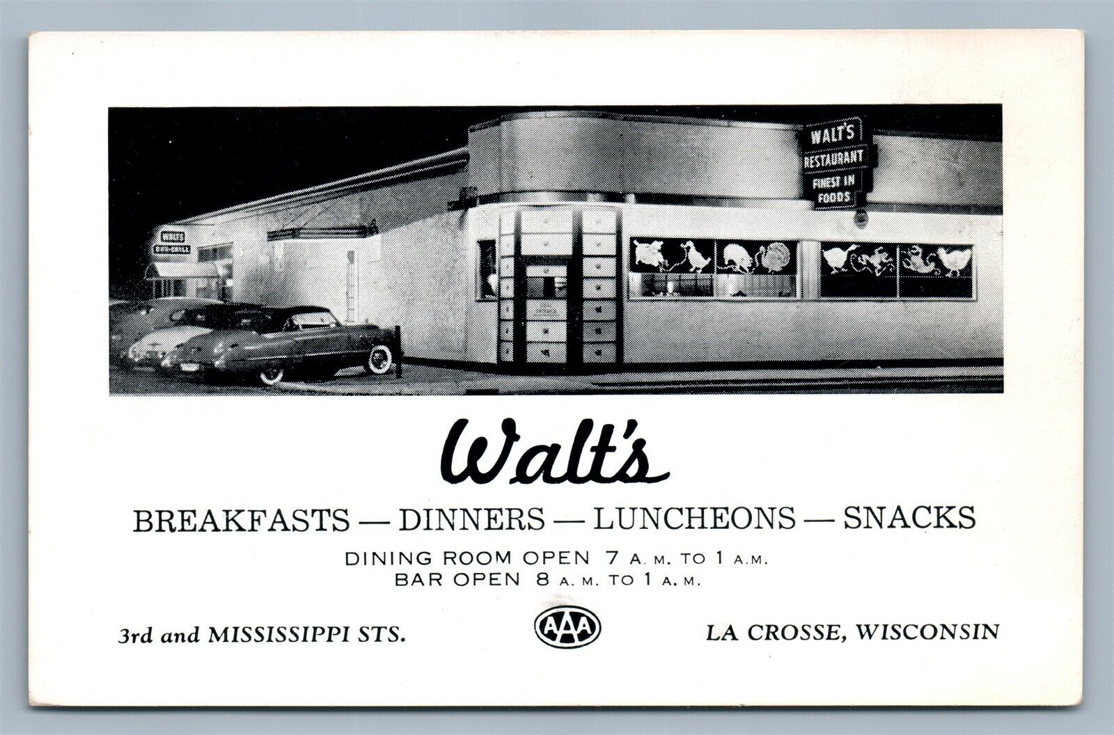 LA CROSSE WI WALT'S RESTAURANT ANDVERTISING VINTAGE POSTCARD