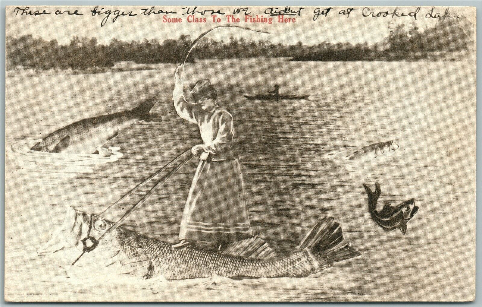 LADY RIDING A FISH ANTIQUE POSTCARD FISHING w/ CORK CANCEL