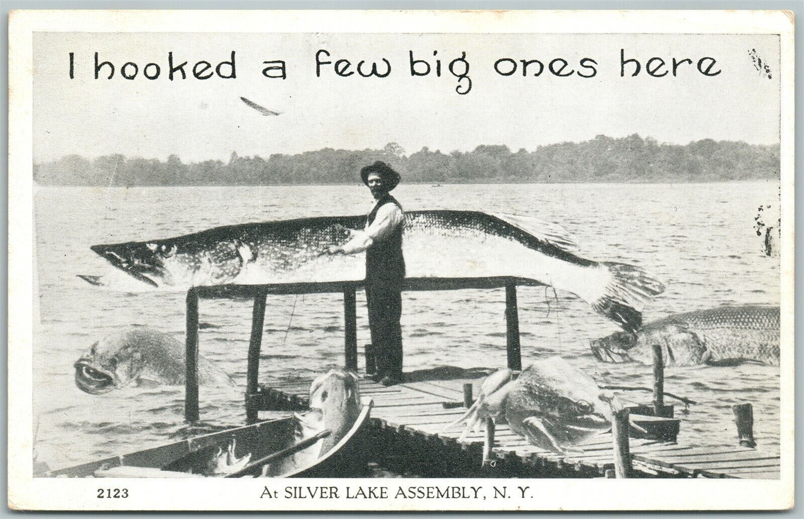 LAKE ASSEMBLY N.Y. EXAGGERATED FISHING 1915 ANTIQUE POSTCARD