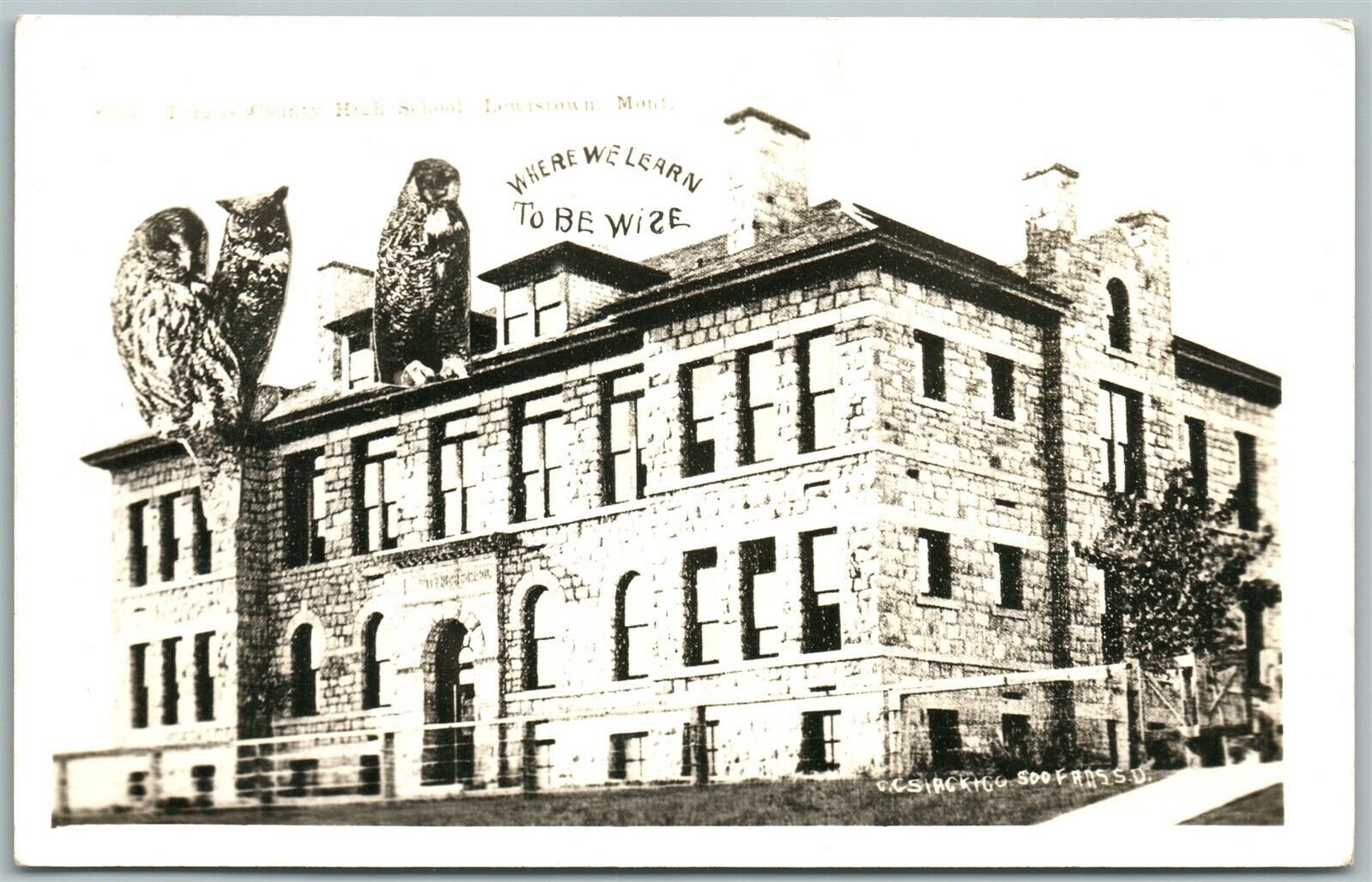 LEWISTOWN MT HIGH SCHOOL WISE OWLS EXAGGERATED ANTIQUE REAL PHOTO POSTCARD RPPC