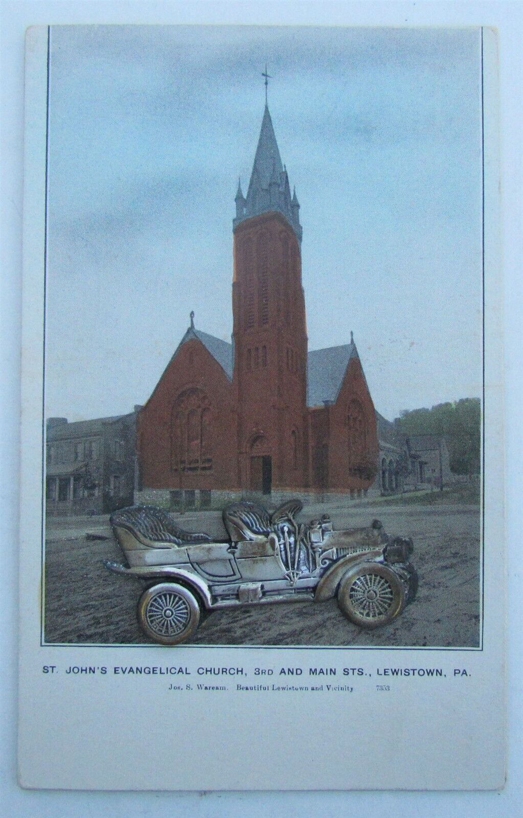 LEWISTOWN PA ST.JOHN CHURCH ANTIQUE POSTCARD w/ APPLIQUE METAL CAR