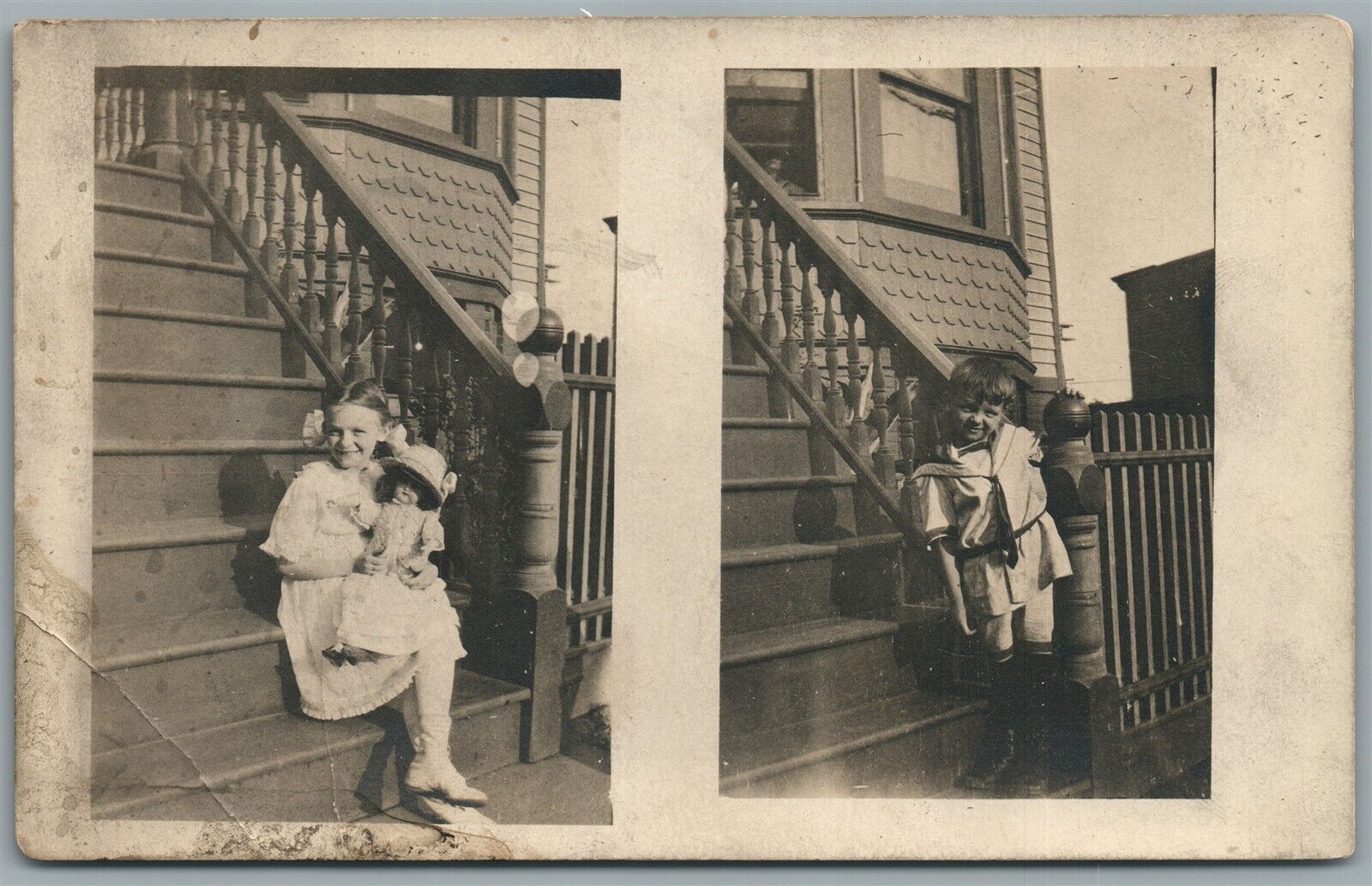LITTLE GIRL w/ DOLL on the HOUSE PORCH ANTIQUE REAL PHOTO POSTCARD RPPC