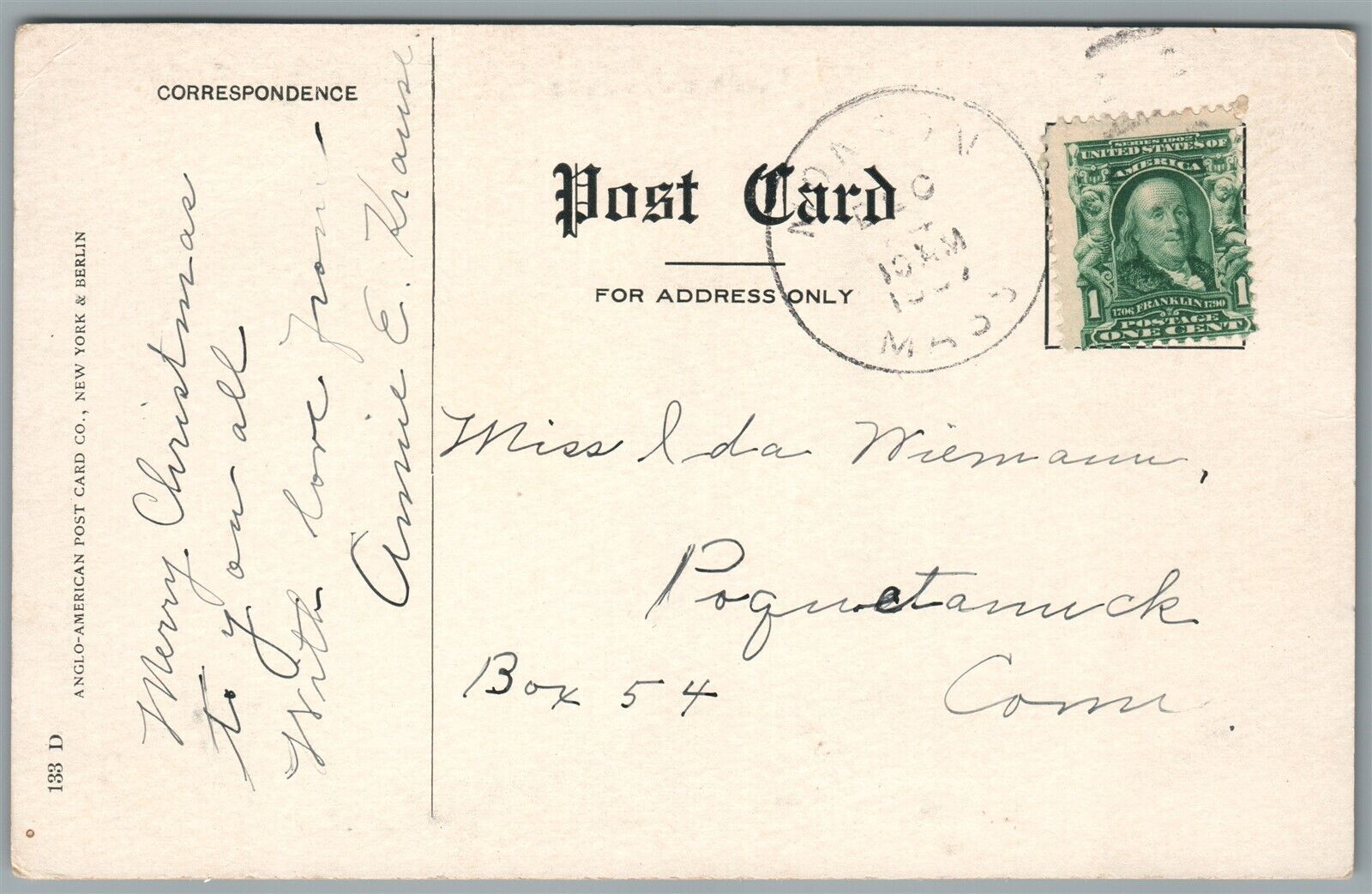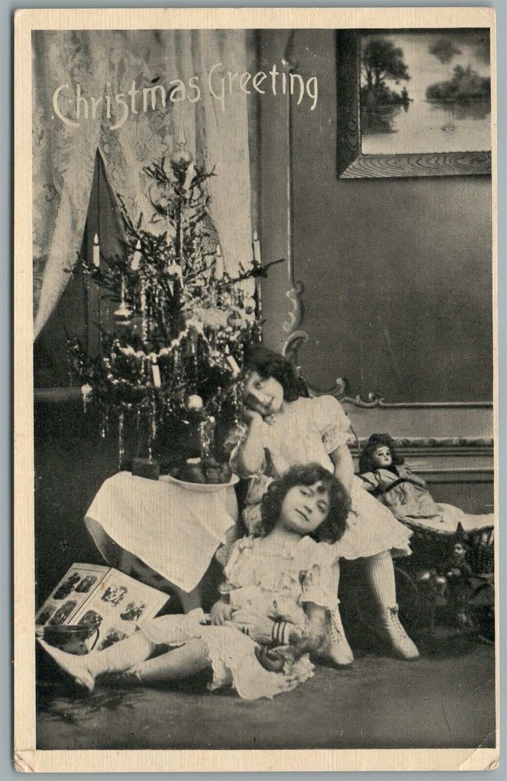 LITTLE SISTERS w/ DOLLS UNDER CHRISTMAS TREE ANTIQUE POSTCARD