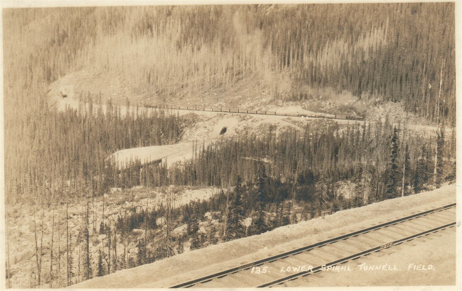 LOWER SPIRAL TUNNEL FIELD CANADA ANTIQUE REAL PHOTO POSTCARD RPPC railroad