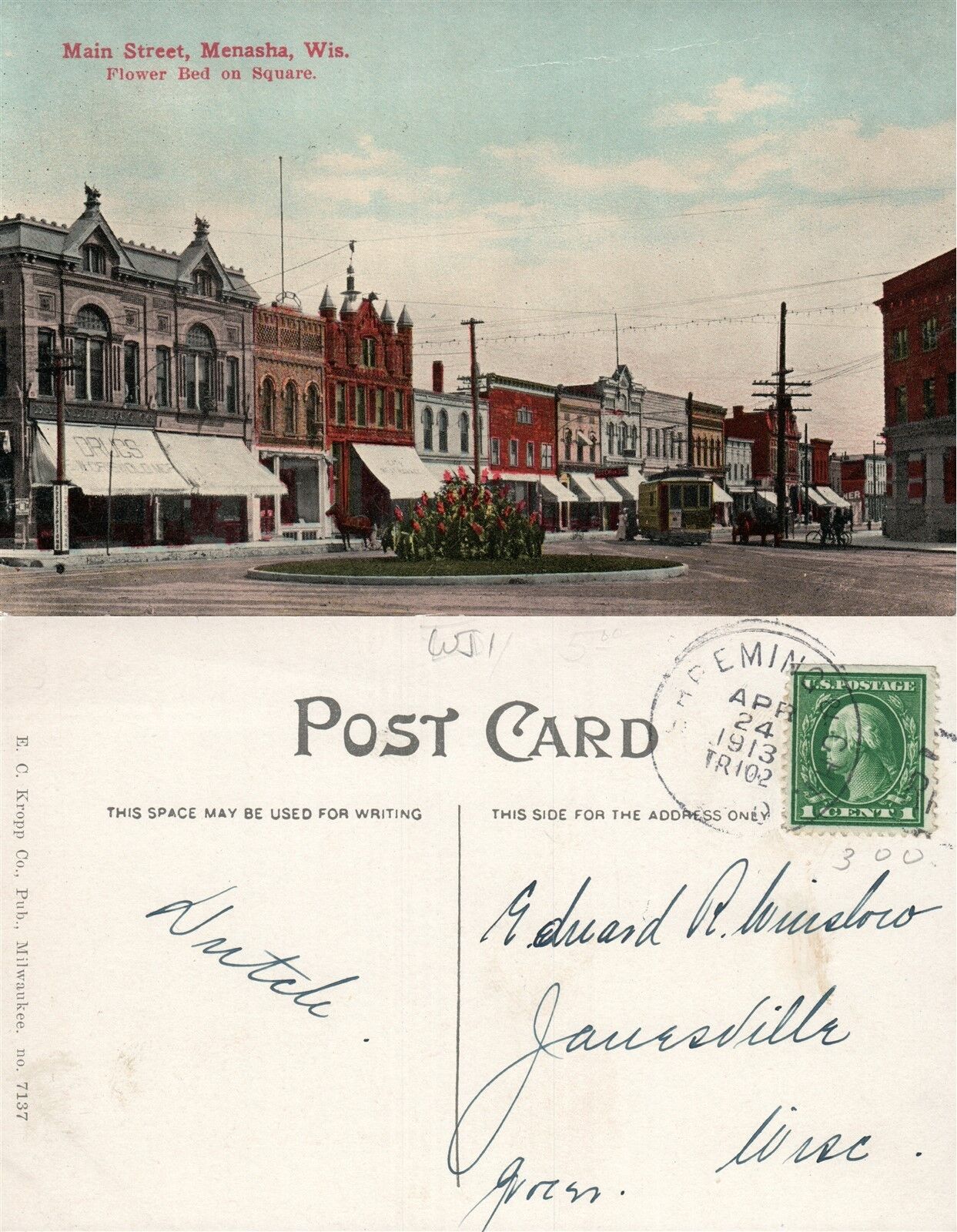 MENASHA WIS. MAIN STREET 1913 ANTIQUE POSTCARD