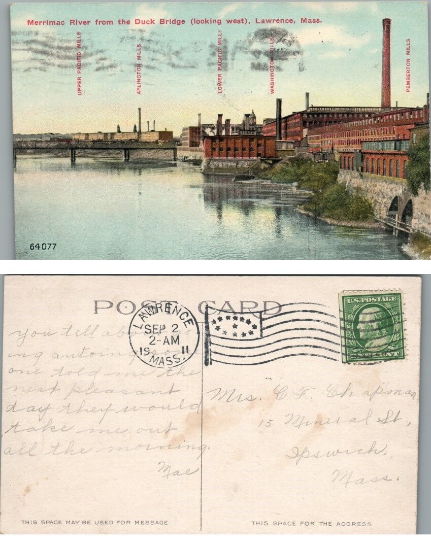MERRIMAC RIVER FROM DUCK BRIDGE LAWRENCE MA 1911 ANTIQUE POSTCARD