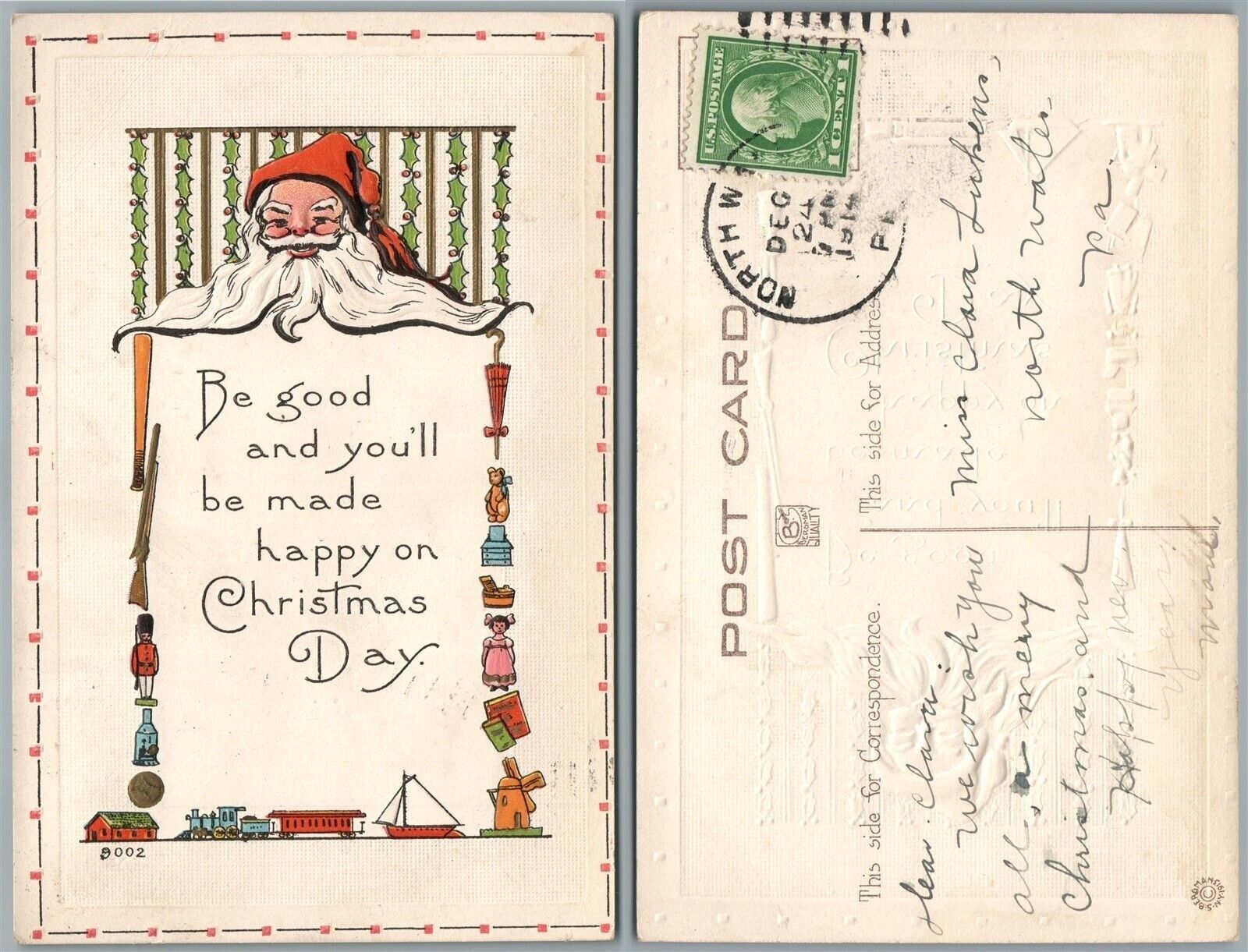 MERRY CHRISTMAS SANTA w/ TOY SOLDIER DOLL BEAR TRAIN SHIP ANTIQUE POSTCARD