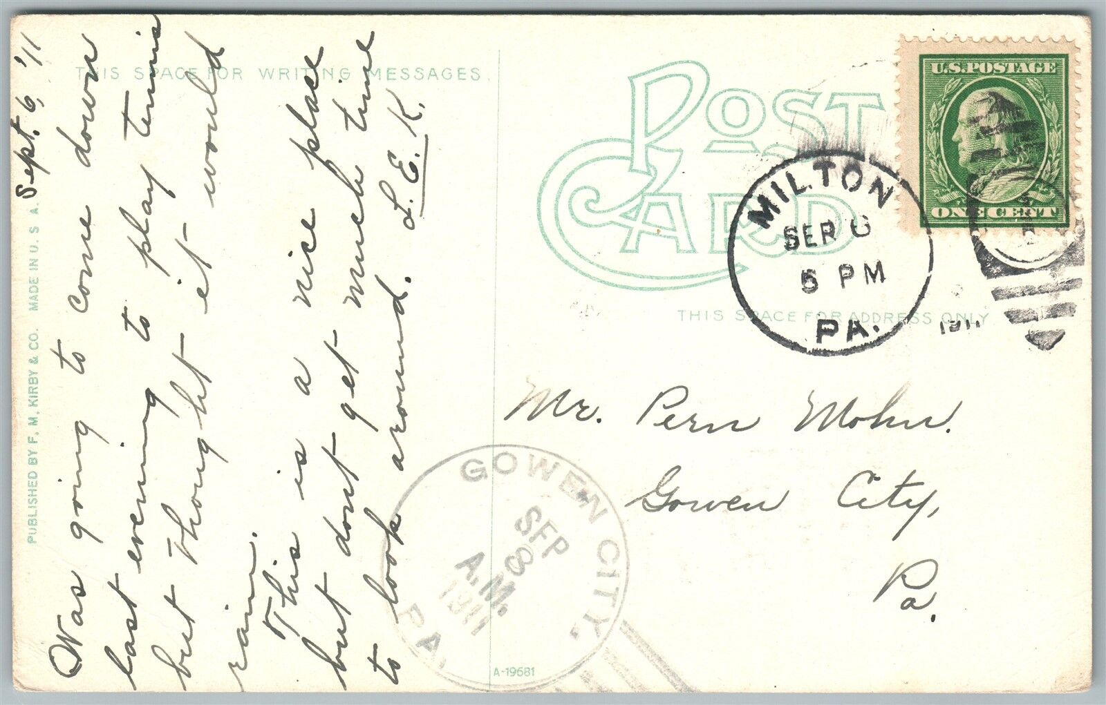 MILTON PA POST OFFICE & ODD FELLOWS HALL 1911 ANTIQUE POSTCARD w/ CORK CANCEL