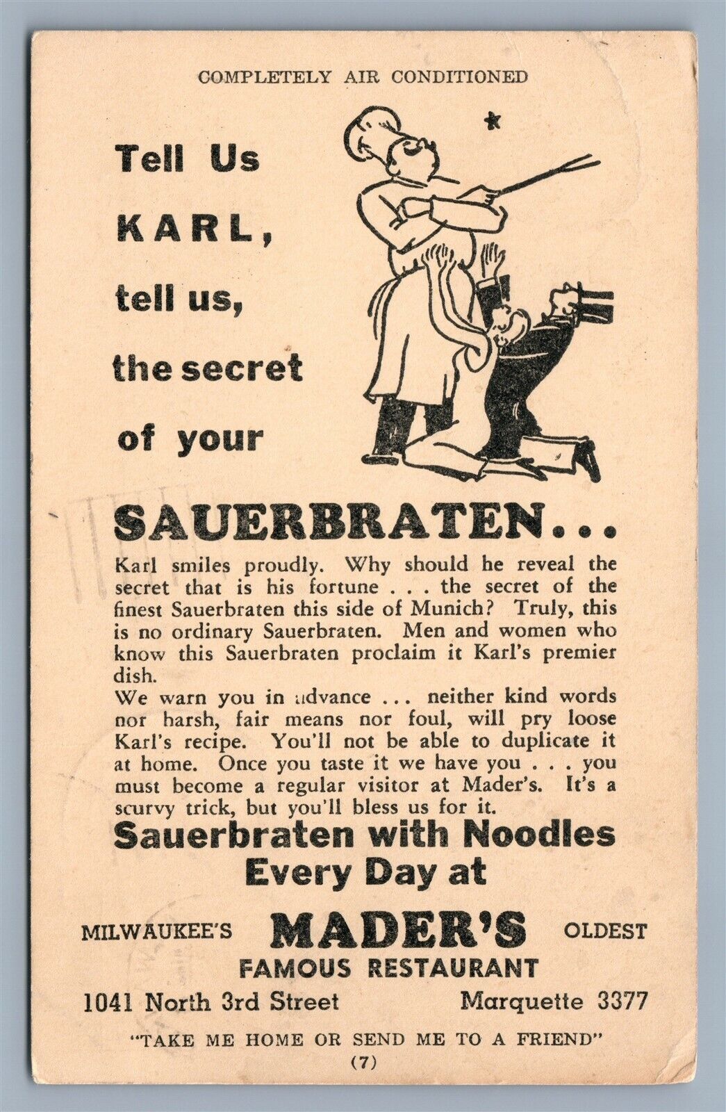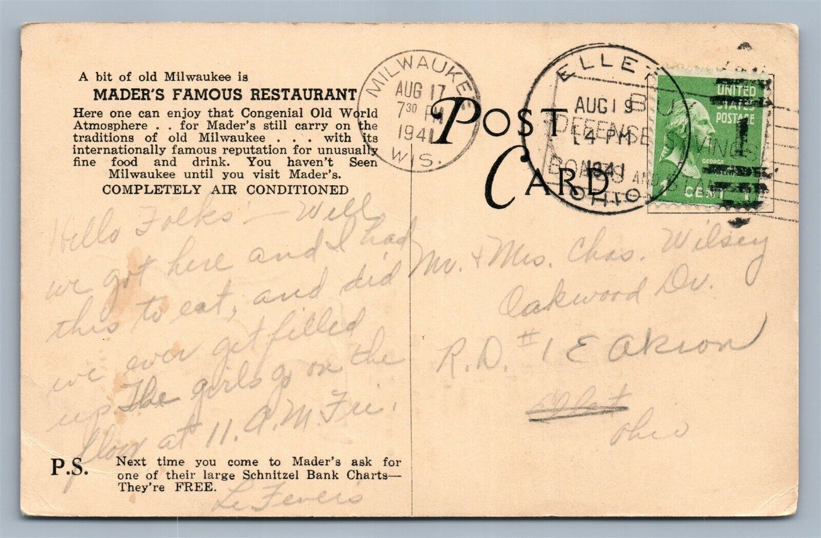 MILWAUKEE WI MADER'S RESTAURANT ADVERTISING 1941 VINTAGE POSTCARD