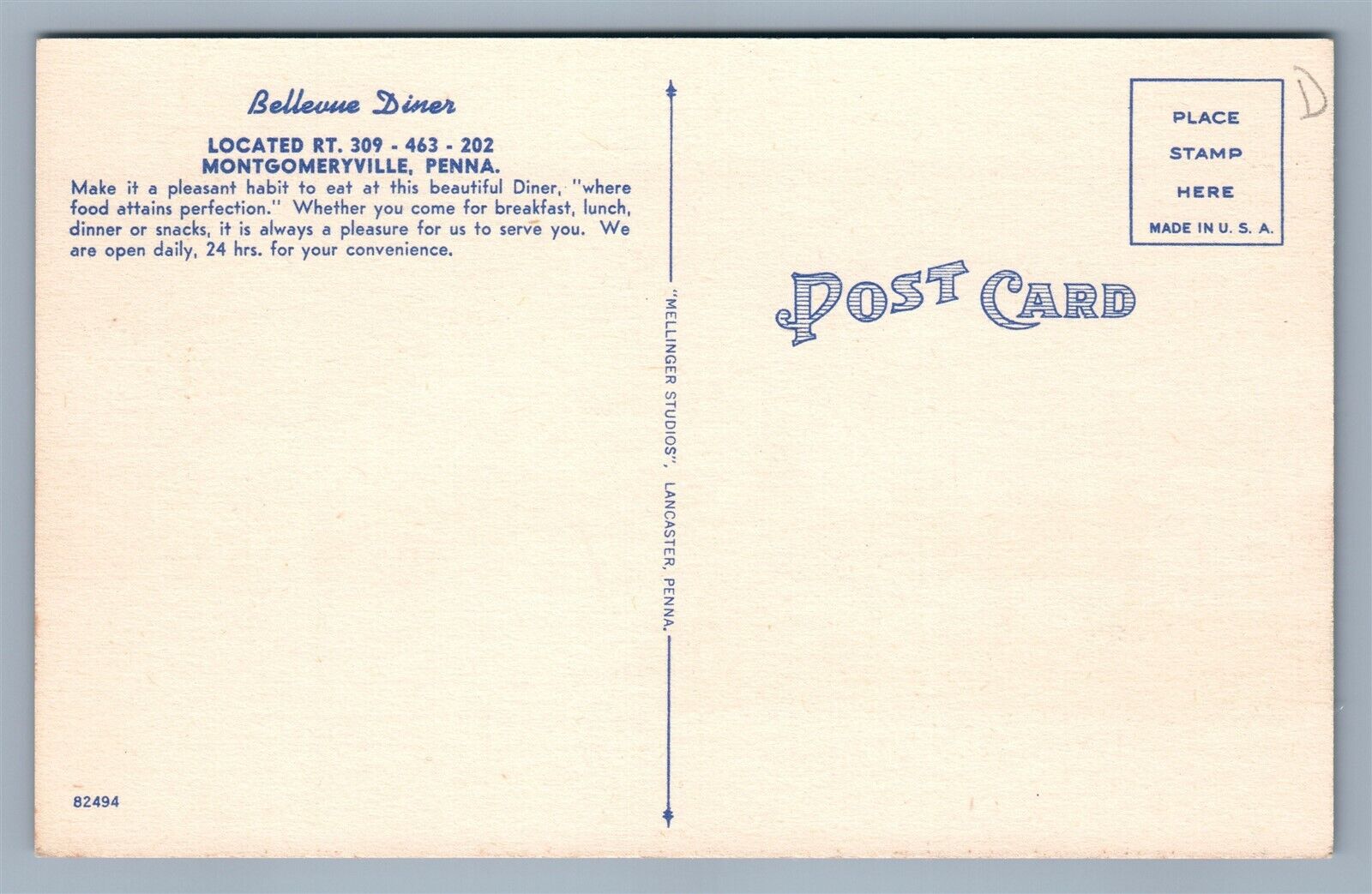 MONTGOMERYVILLE PA BELLEVUE DINNERS ADVERTISING VINTAGE POSTCARD