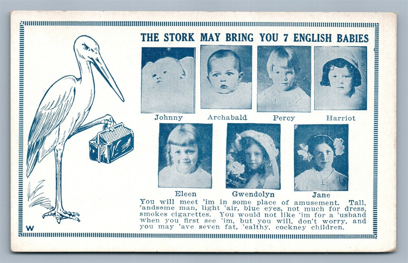MULTI 7 ENGLISH BABIES w/ STORK ANTIQUE POSTCARD