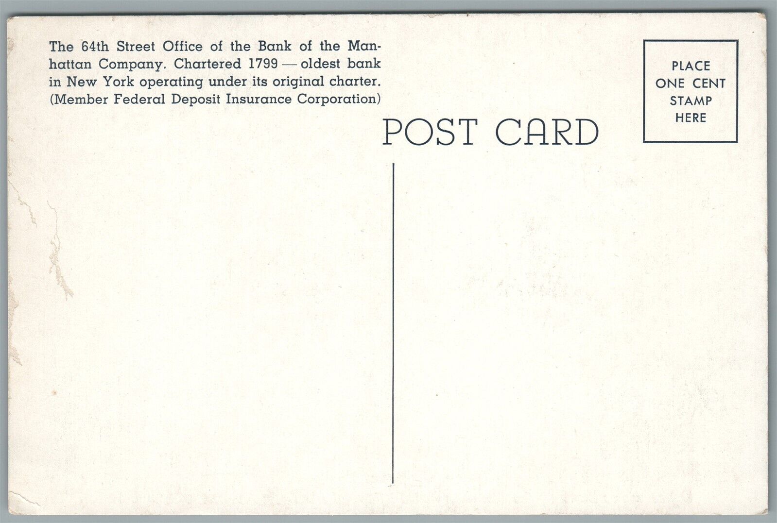 NEW YORK NY BANK OF MANHATTAN COMPANY MADISON AVENUE & 64 STR. ANTIQUE POSTCARD