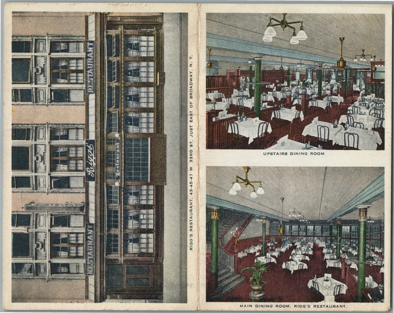 NEW YORK NY RIGG'S RESTAURANT ADVERTISING FOLDING DOUBLE ANTIQUE POSTCARD