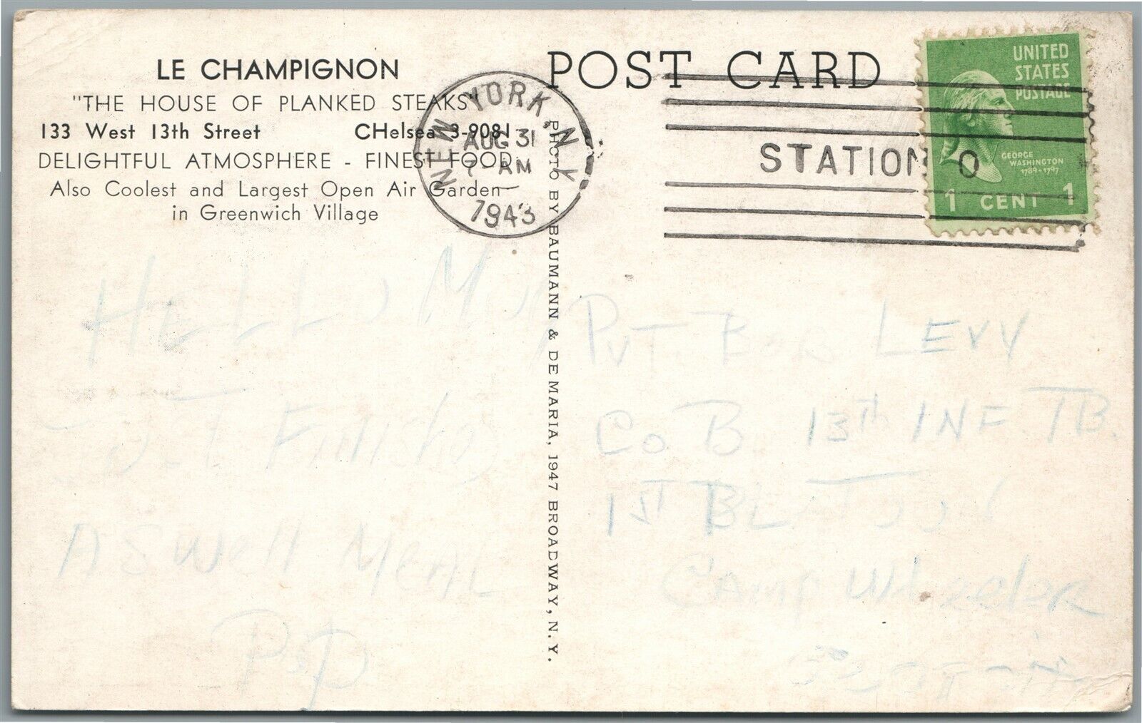 NEW YORK NY West 13th STR HOUSE of PLANKED STEAKS LE CHAMPIGNON ANTIQUE POSTCARD
