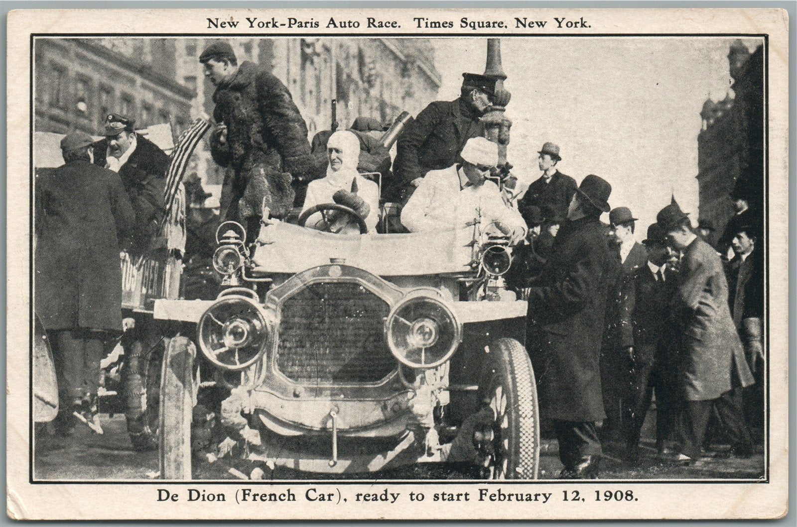 NEW YORK - PARIS AUTO RACE FRENCH CAR 1908 ADVERTISING ANTIQUE POSTCARD