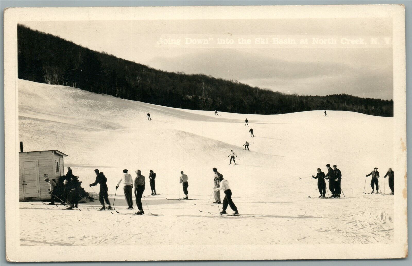 NORTH CREEK NY SKIERS GOING DOWN VINTAGE REAL PHOTO POSTCARD RPPC