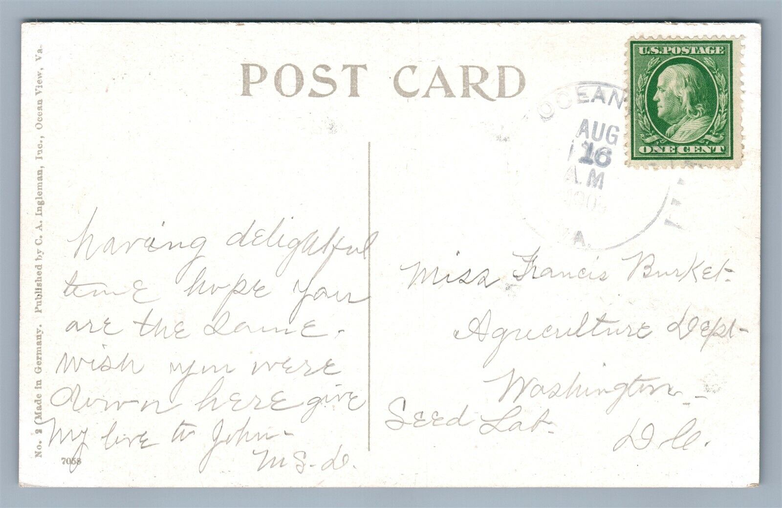 OCEAN FRONT OCEAN VIEW VA ANTIQUE POSTCARD