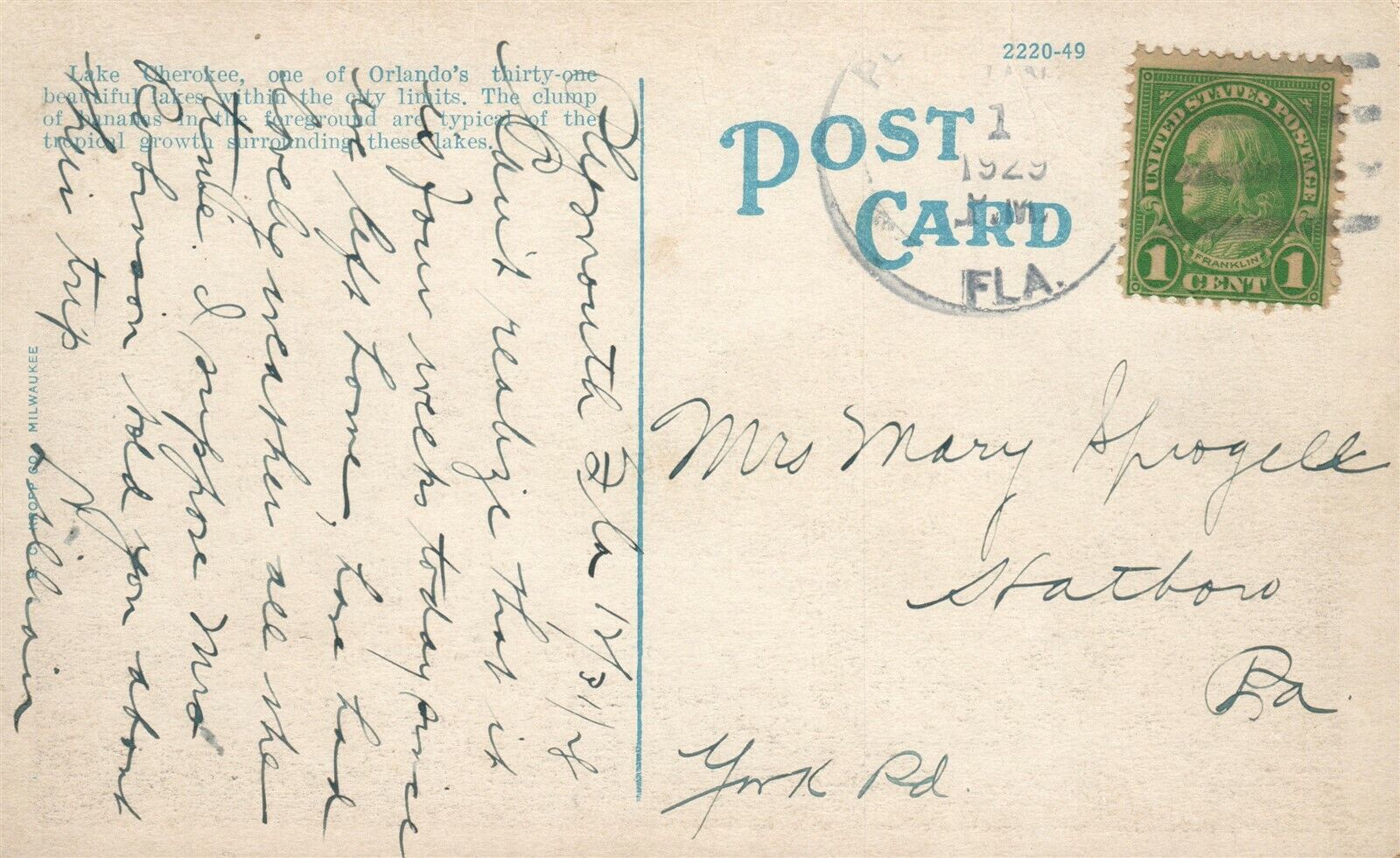 ORLANDO FL LAKE CHEROKEE 1929 ANTIQUE POSTCARD