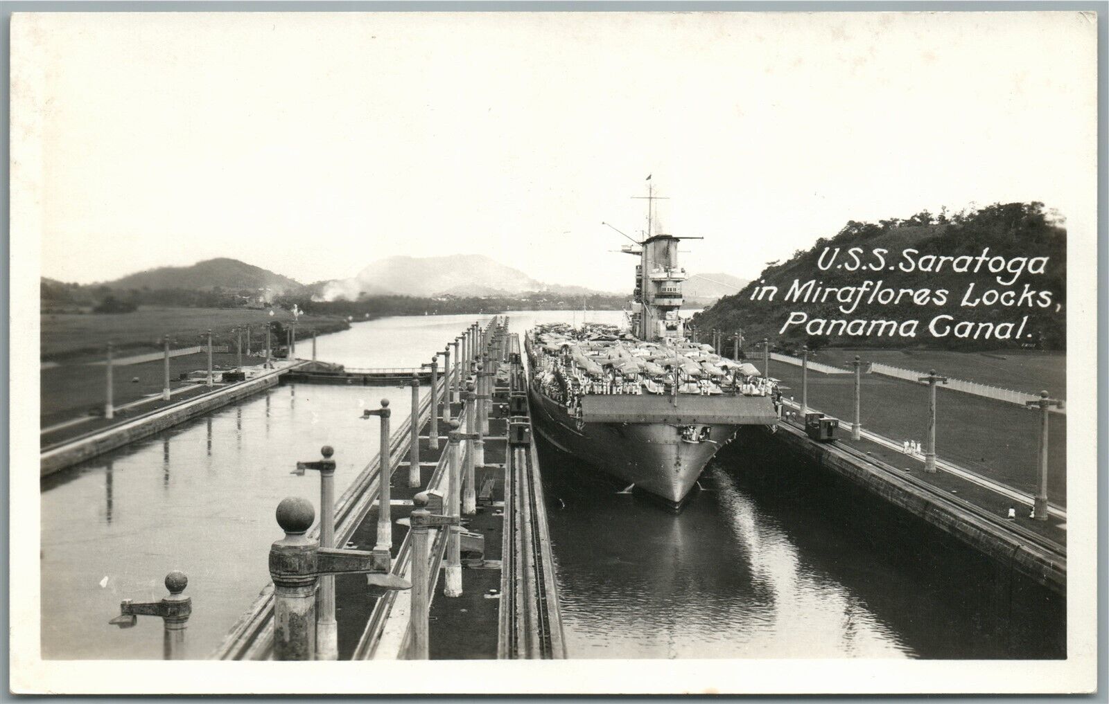 PANAMA CANAL USS SARATOGA ANTIQUE REAL PHOTO POSTCARD RPPC