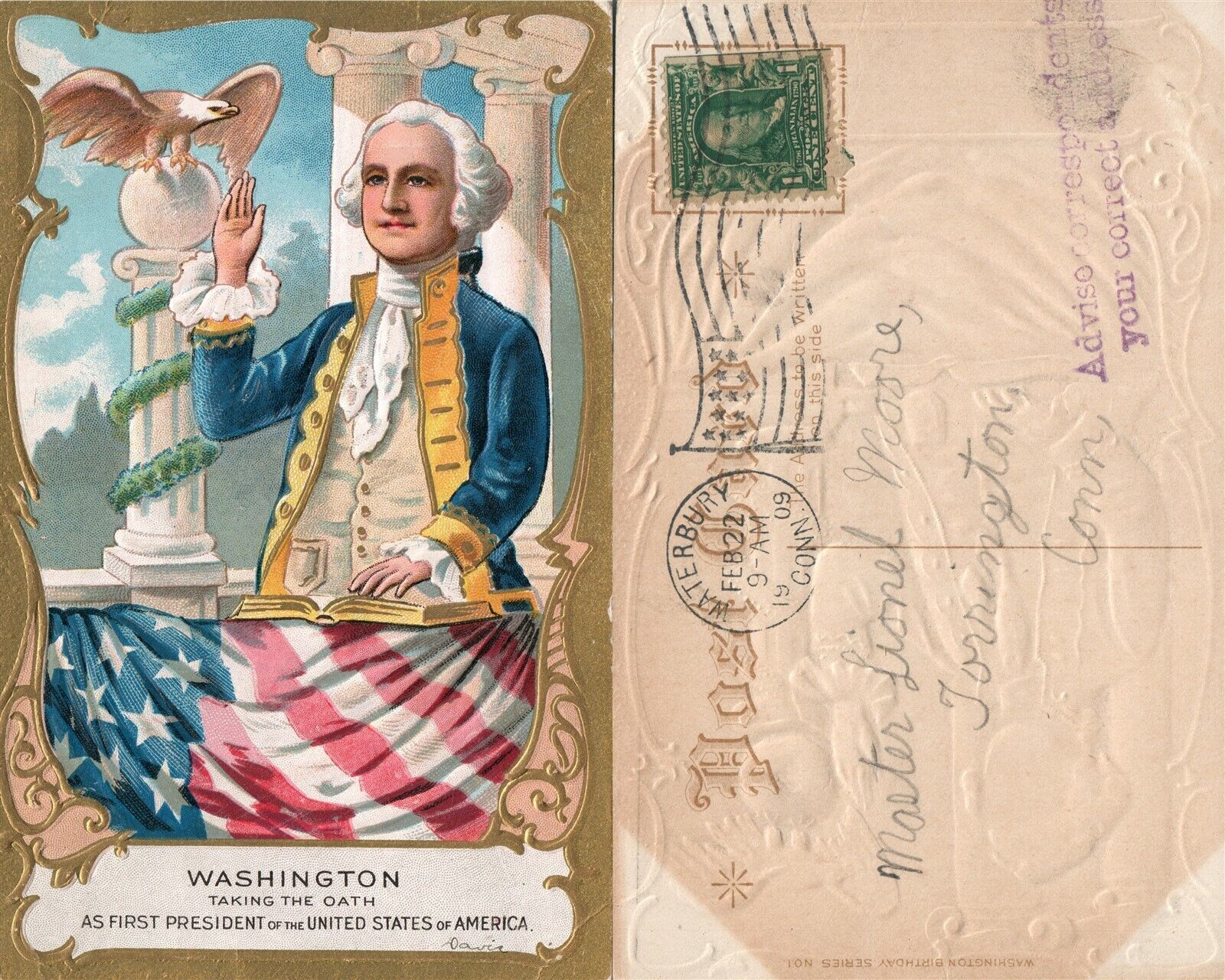 PATRIOTIC ANTIQUE EMBOSSED 1909 POSTCARD WASHINGTON TAKING OATH AS PRESIDENT
