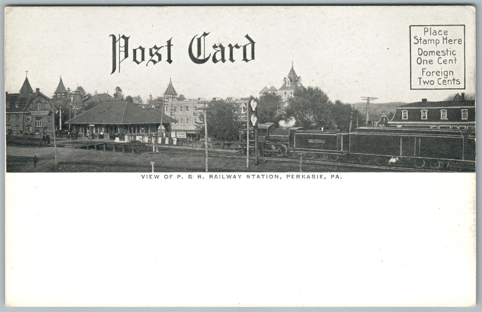 PERKASIE BUCKS CO PA PUBLIC SCHOOL RAILWAY STATION ANTIQUE DOUBLE SIDED POSTCARD