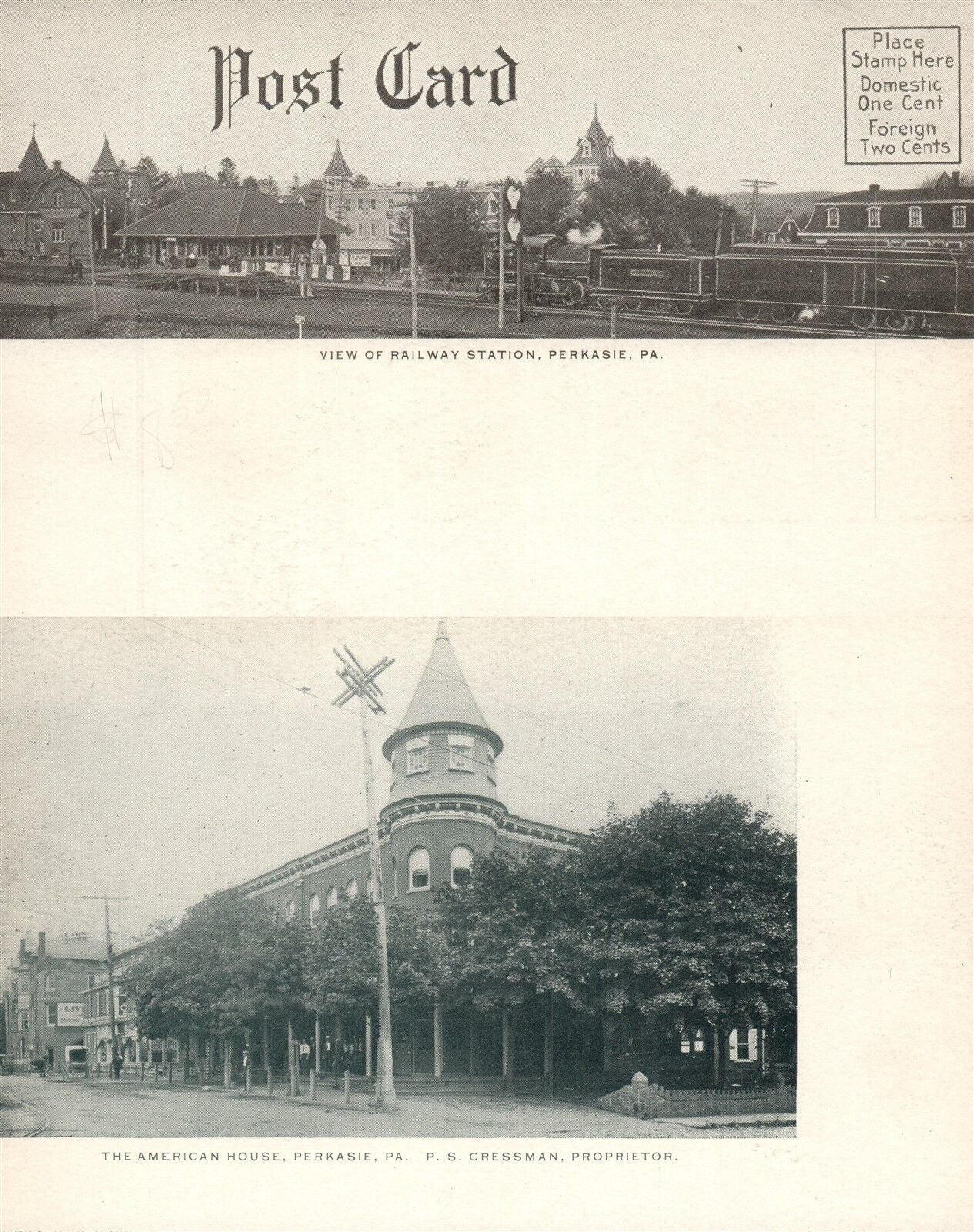 PERKASIE PA RAILROAD STATION & AMERICAN HOUSE ANTIQUE POSTCARD railway depot