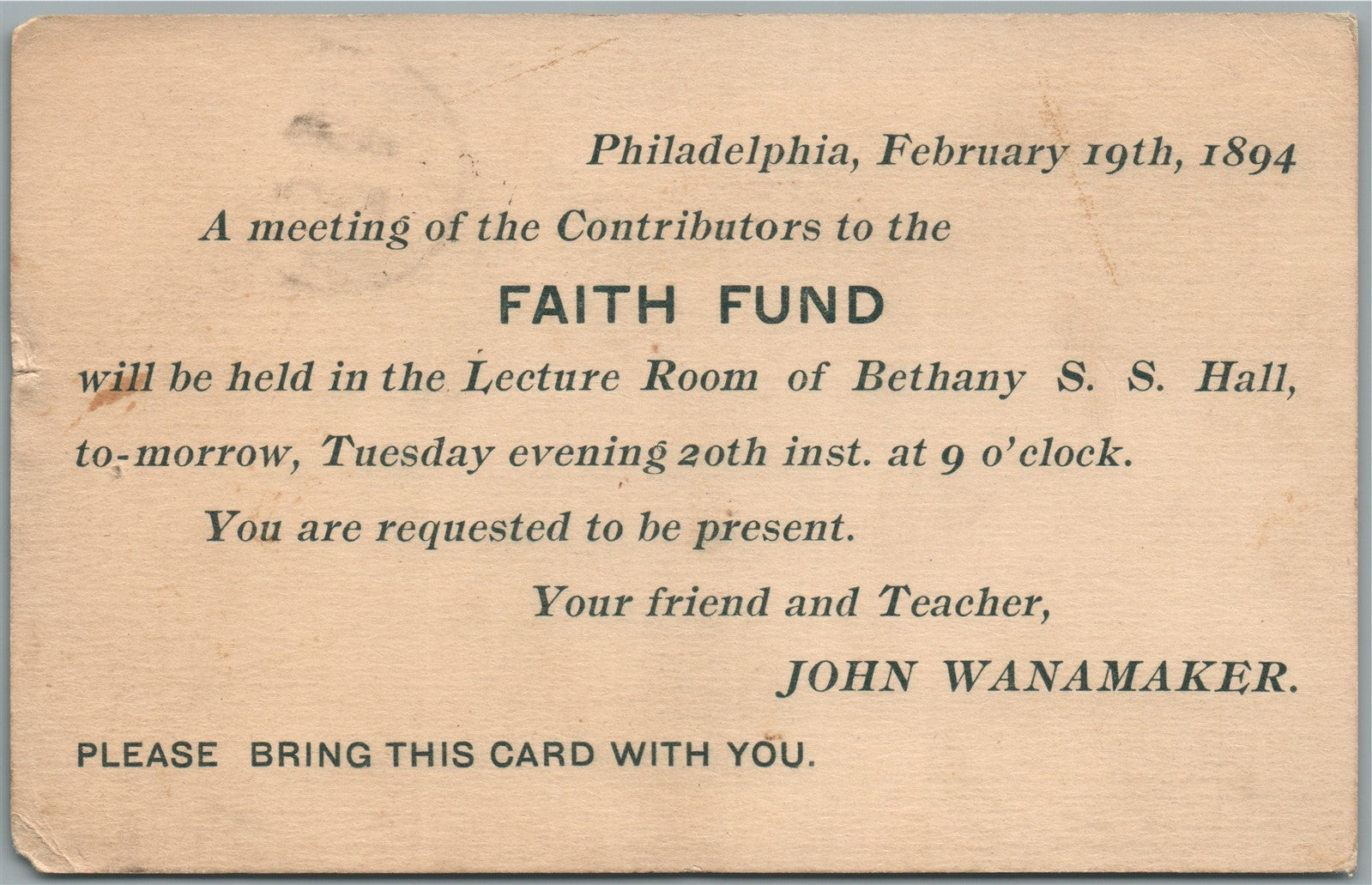 PHILADELPHIA PA JOHN WANAMAKER FAITH FUND MEETING INVITATION ANTIQUE POSTCARD