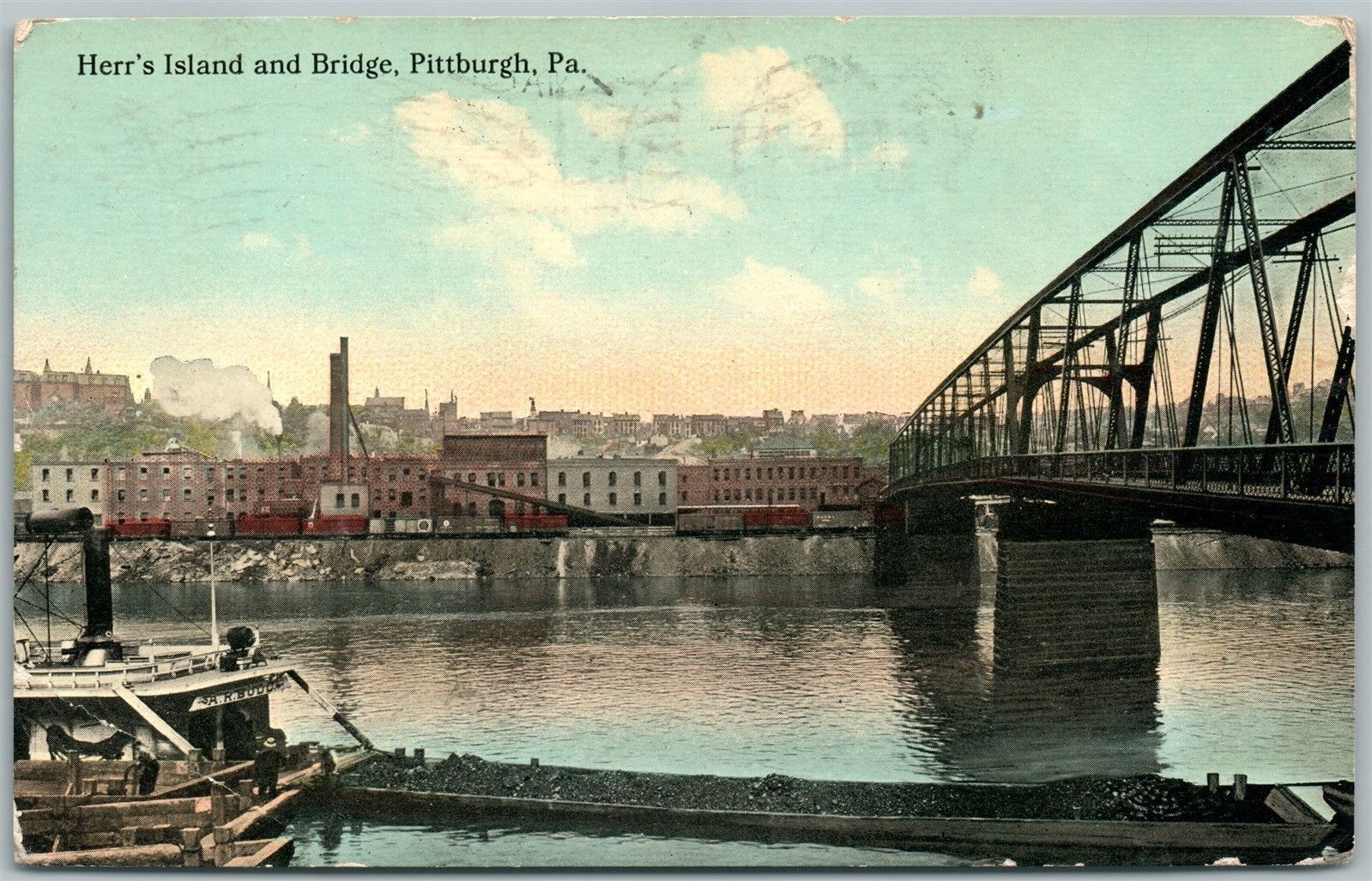 PITTSBURG PA HERR'S ISLAND & BRIDGE 1914 ANTIQUE POSTCARD