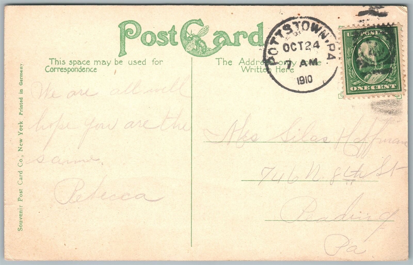 POTTSTOWN PA HOSPITAL 1910 ANTIQUE POSTCARD