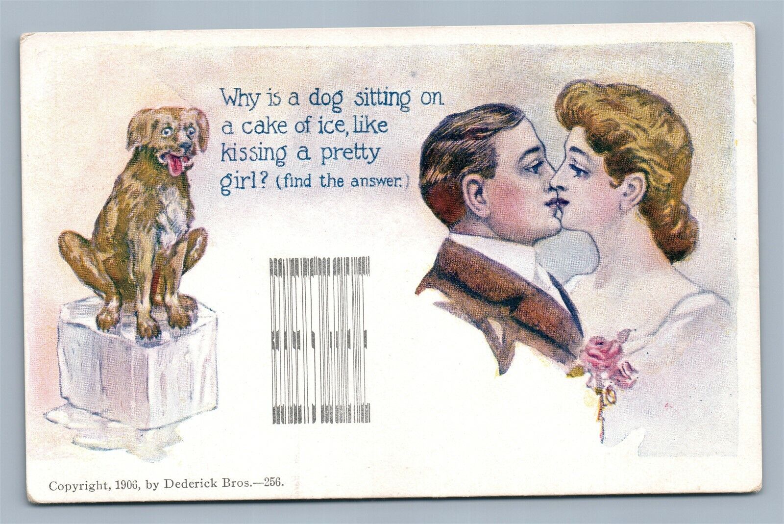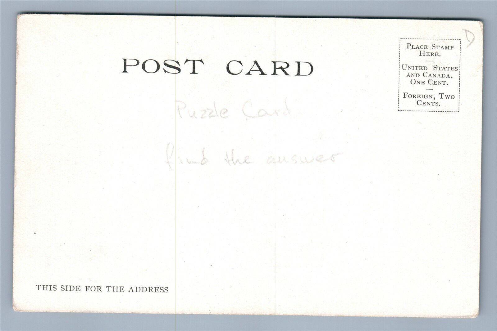 PUZZLE CARD FING THE ANSWER ANTIQUE POSTCARD WHY IS A DOG SITTING ON CAKE OF ICE