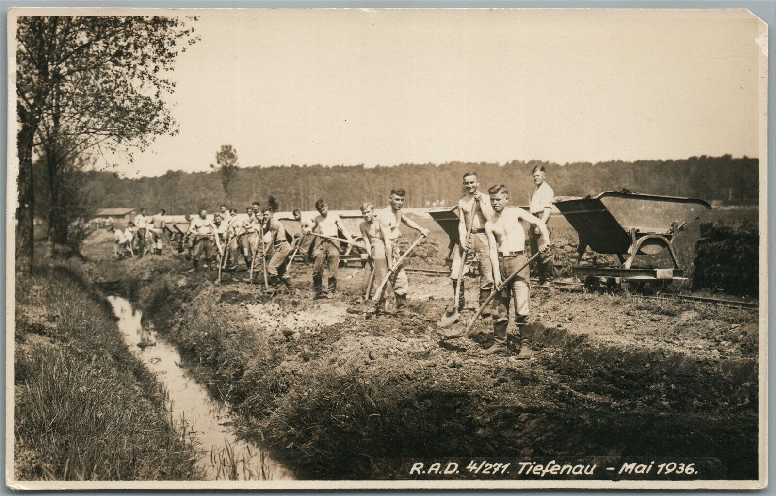 R.A.D. at WORK 1936 TIEFENAU RAILWAY VINTAGE GERMAN REAL PHOTO POSTCARD RPPC