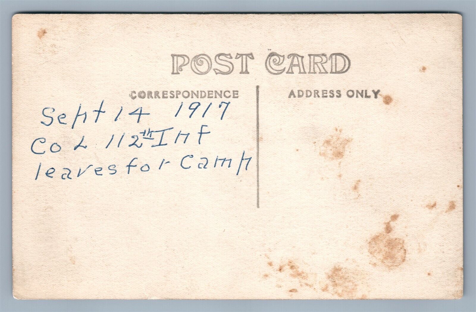 RAILWAY STATION INFANTRY UNIT LEAVES FOR CAMP ANTIQUE REAL PHOTO POSTCARD RPPC