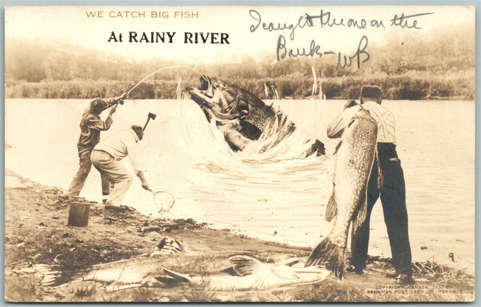 RAINY RIVER ONT. CANADA FISHING EXAGGERATED ANTIQUE REAL PHOTO POSTCARD RPPC