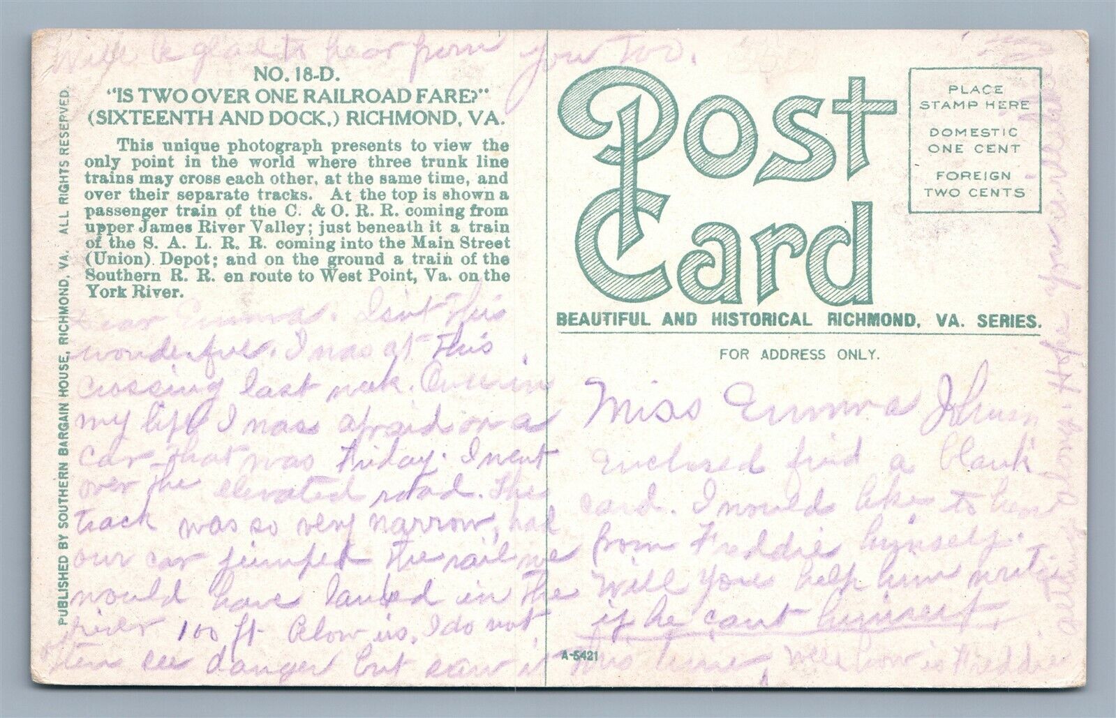 RICHMOND VA IS TWO OVER ONE RAILROAD FARE ANTIQUE POSTCARD