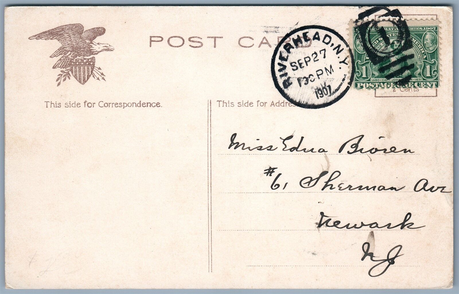 RIVERHEAD LONG ISLAND NY OLD RED MILL 1907 ANTIQUE POSTCARD w/ CORK CANCEL