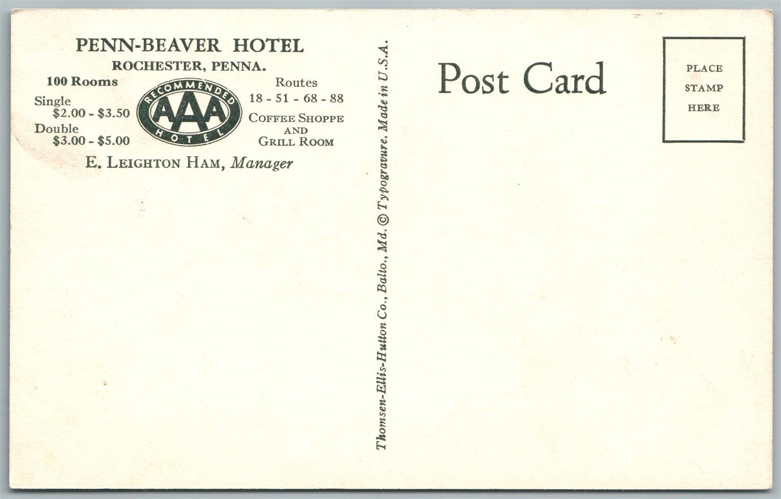 ROCHESTER PA PENN-BEAVER HOTEL AAA RECOMMENDED ADVERTISING ANTIQUE POSTCARD