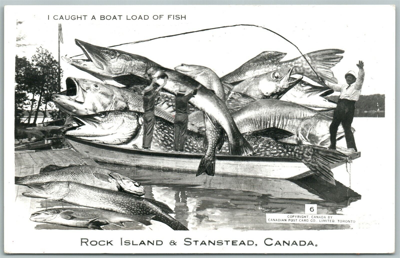 ROCK ISLAND & STANSTEAD CANADA EXAGGERATED FISHING VINTAGE REAL PHOTO PC RPPC