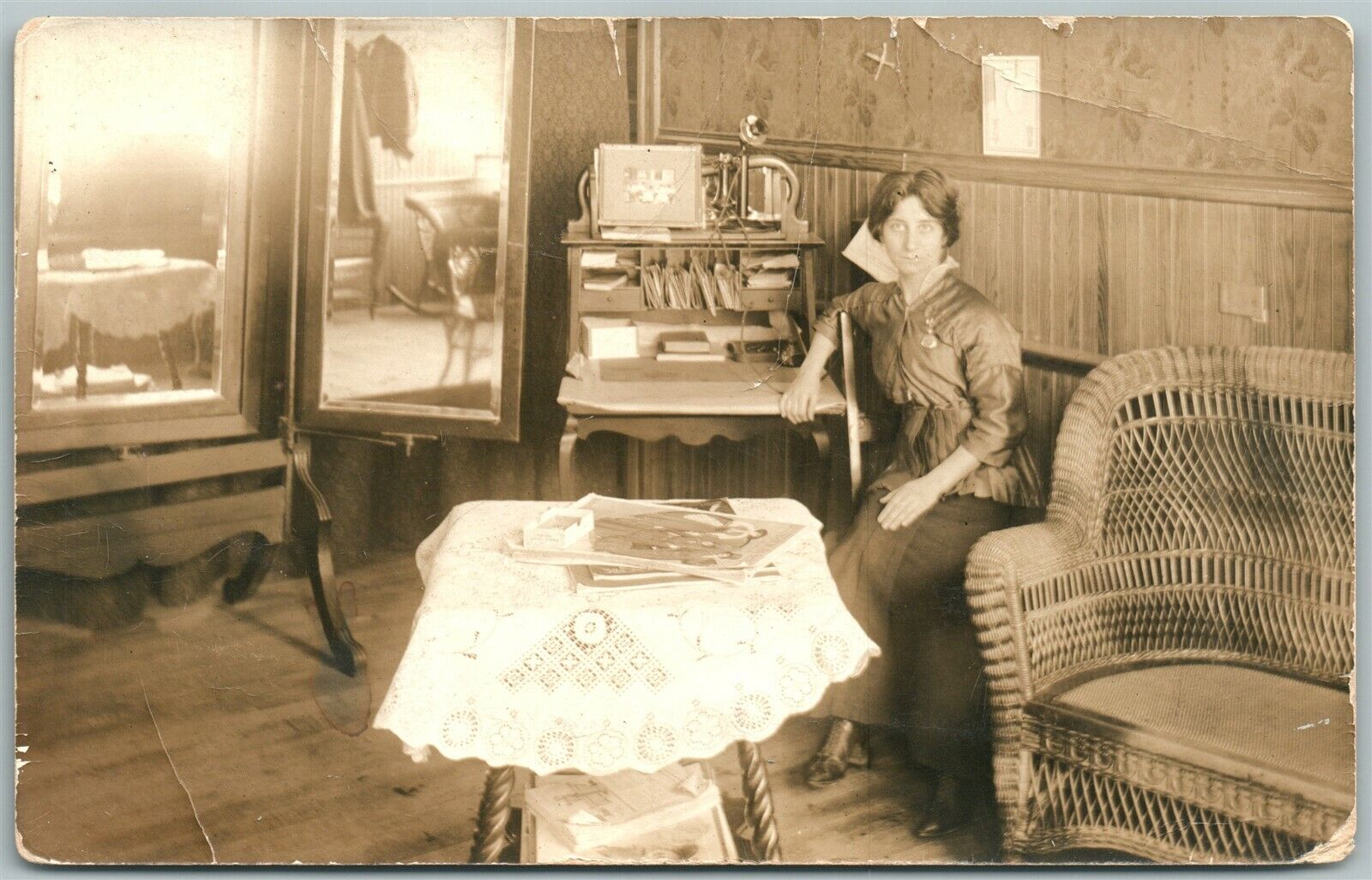 ROOM INTERIOR w/ LADY ANTIQUE REAL PHOTO POSTCARD RPPC
