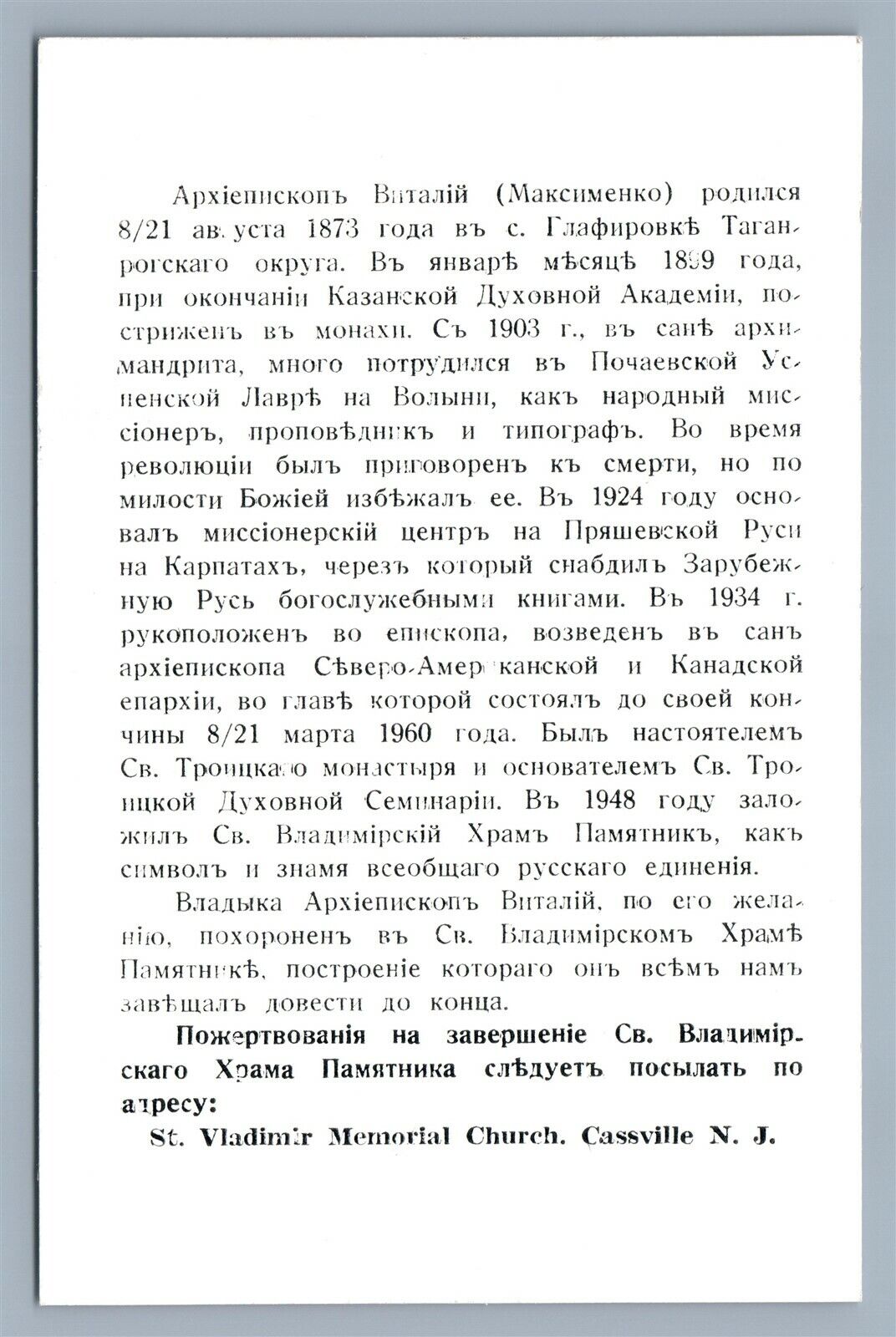 ARCHBISHOP VITALII (1873-1960) , AMERICAN ARCHBISHOP, CREATOR OF ST.VLADIMIR'S CHURCH IN CASSVILE, NJ