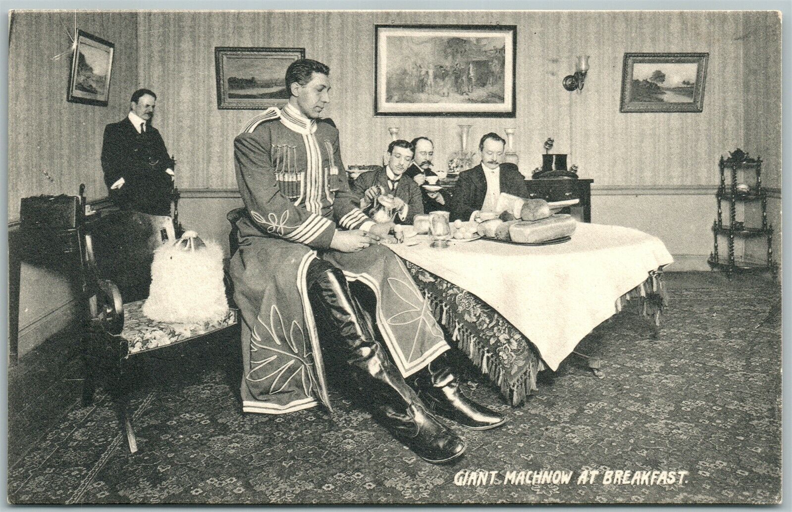 RUSSIAN GIANT MACHNOW AT BREAKFAST ANTIQUE POSTCARD