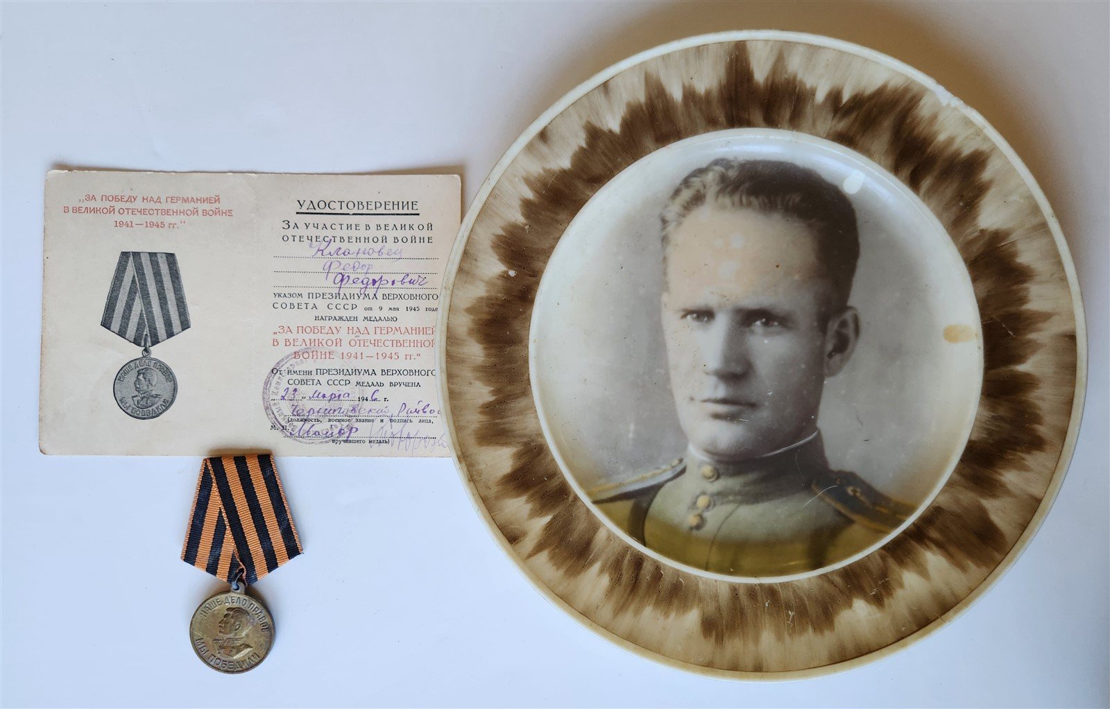 RUSSIAN SOVIET WWII MEDAL FOR VICTORY OVER GERMANY w/ID & SOLDIER PORTRAIT PLATE