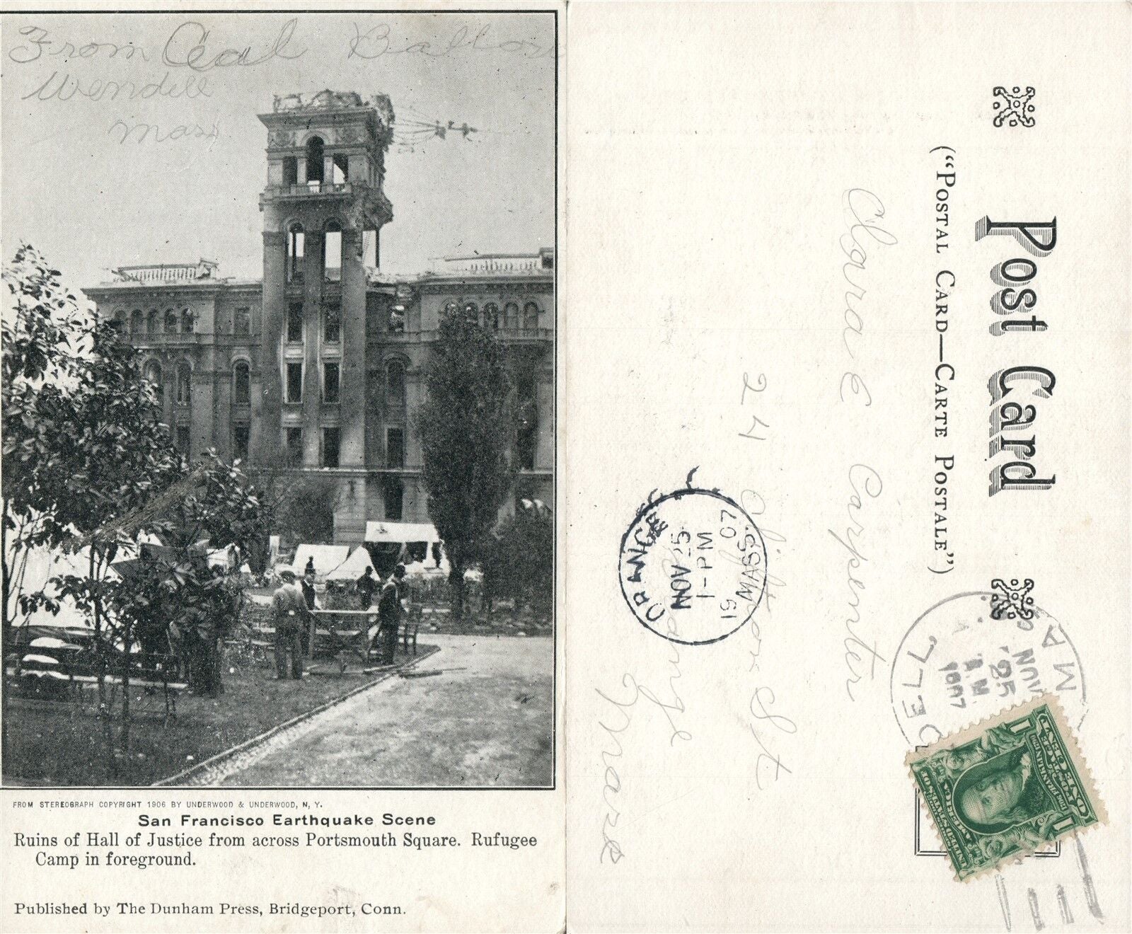 SAN FRANCISCO EARTHQUAKE 1906 SHALL OF JUSTICE RUINS UNDIVIDED ANTIQUE POSTCARD