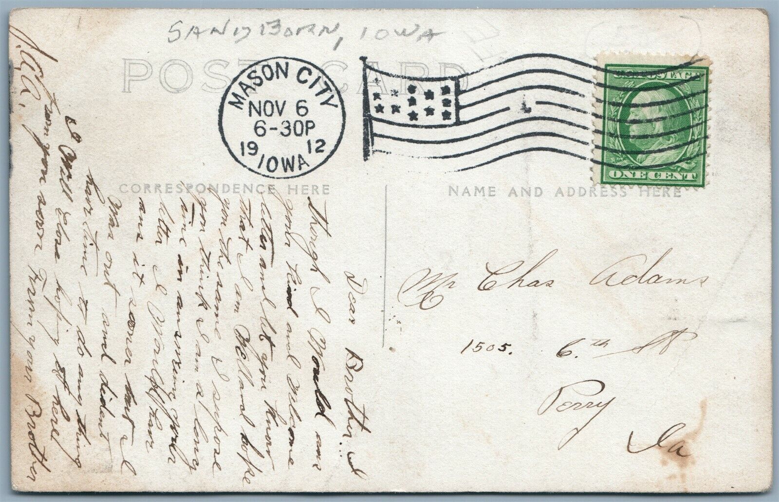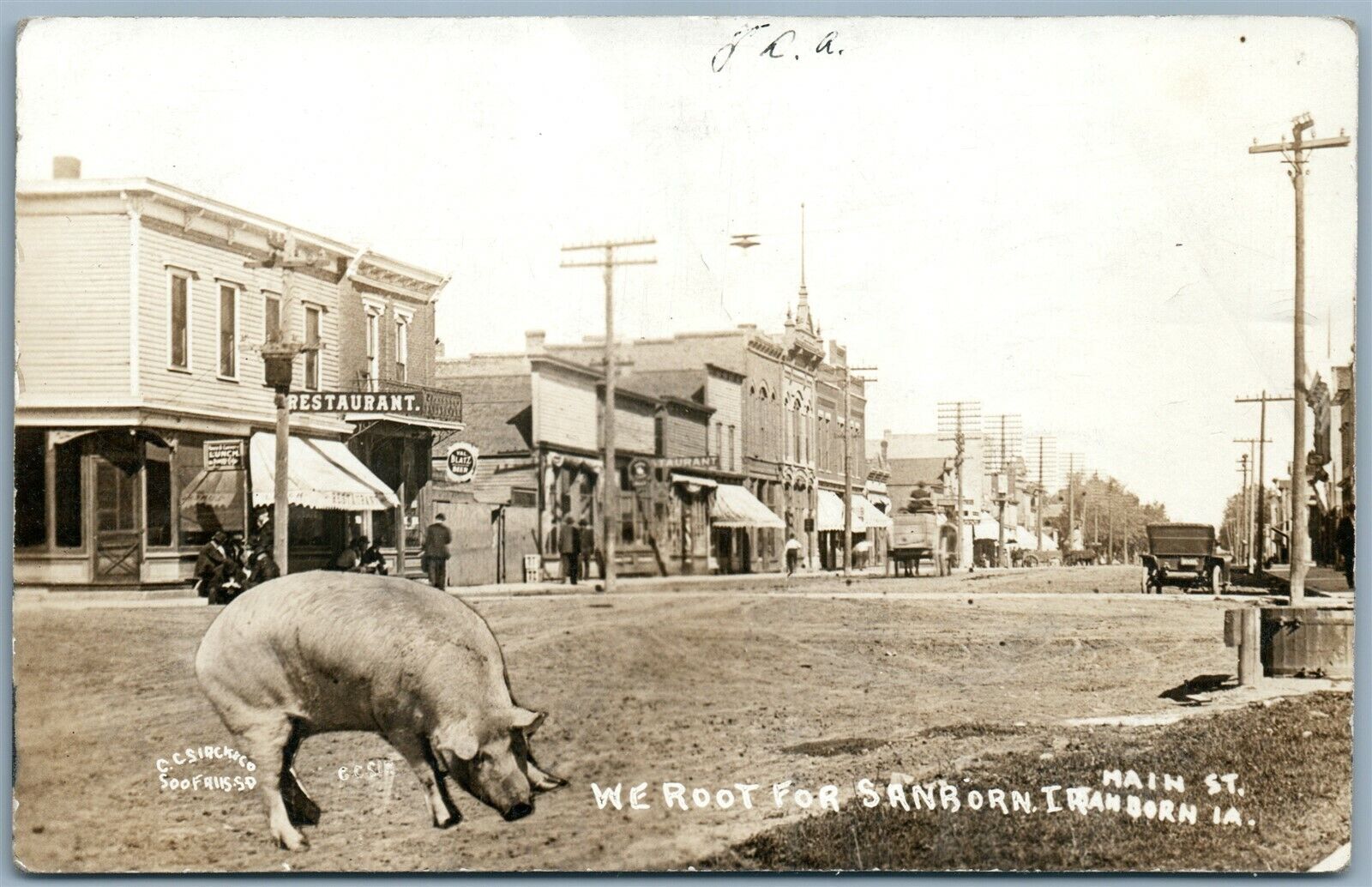 SANBORN IA MAIN STREET SCENE w/ PIG 1912 ANTIQUE PHOTOMONTAGE REAL PHOTO RPPC