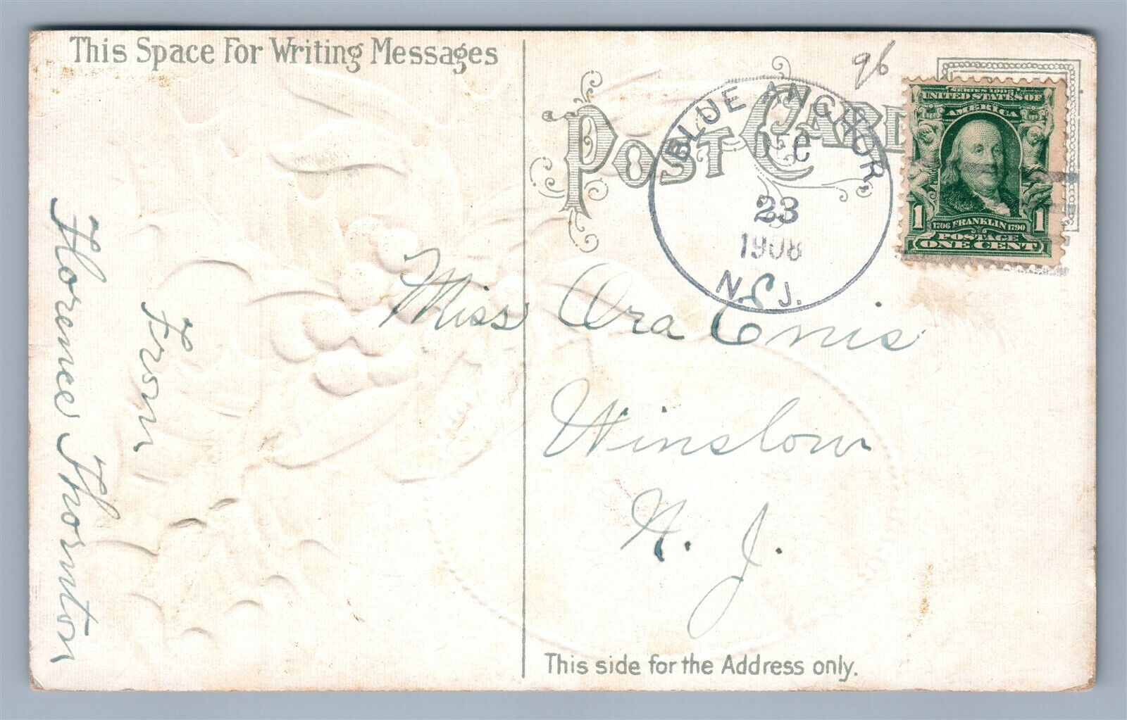 SANTA CLAUS in LIGHT GREEN ROBE w/ CHRISTMAS TREE EMBOSSED 1908 ANTIQUE POSTCARD