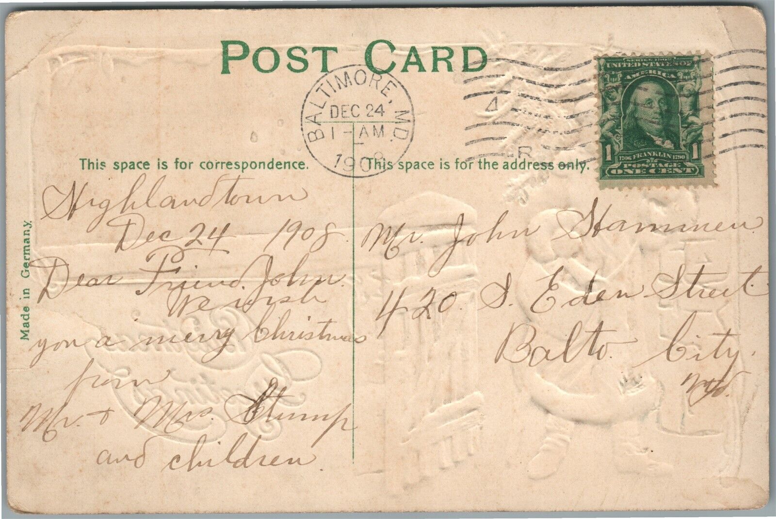 SANTA in GREEN ROBE CHRISTMAS GREETINGS EMBOSSED ANTIQUE POSTCARD